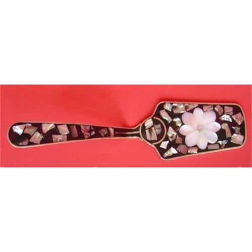 This cake server from Mexico is guaranteed to take all the calories but none of the taste from anything it serves. Encased in silver, this cake server is decorated with mother of pearl inlay in onyx. Hallmarked with Alpaca and Mexico on the back.There is one small break in the onyx in the circle area but otherwise in excellent vintage condition. This cake server measures approximately 10" in length.