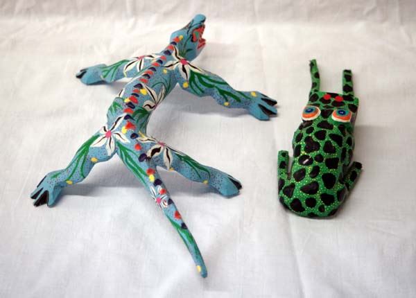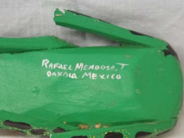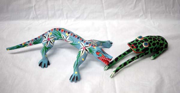 Mexican Oaxacan Alebrije Alligator and Frog, both are by Rafael Mendoza T. Oaxaca Mexico, largest measures 6'' x 9.5'', both are vibrantly painted