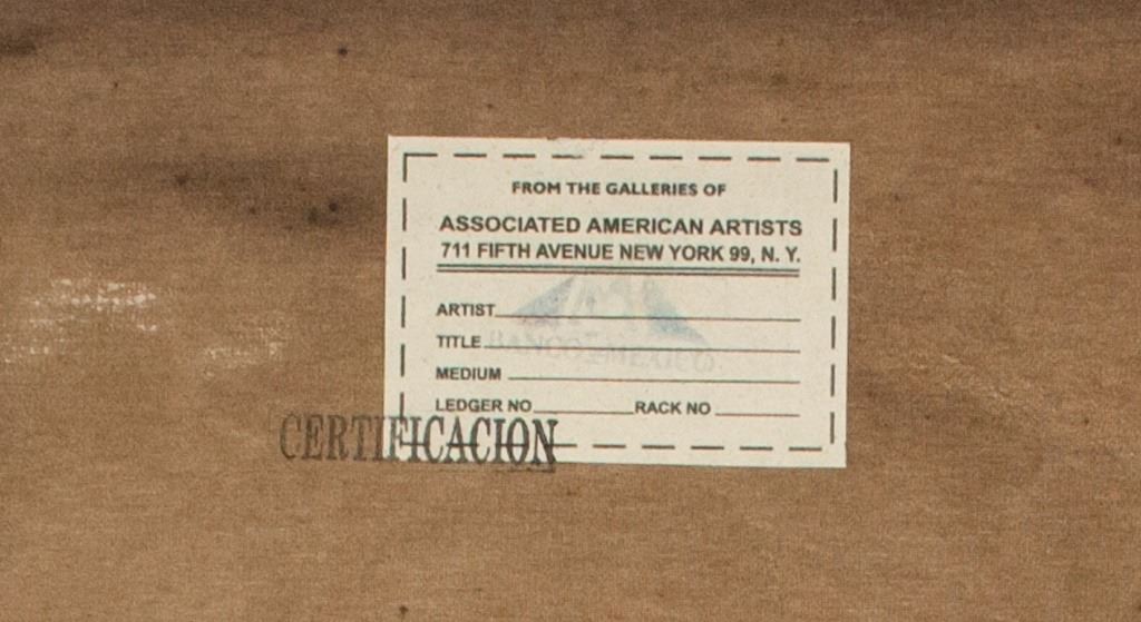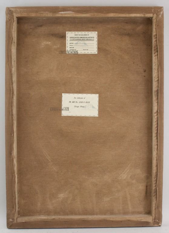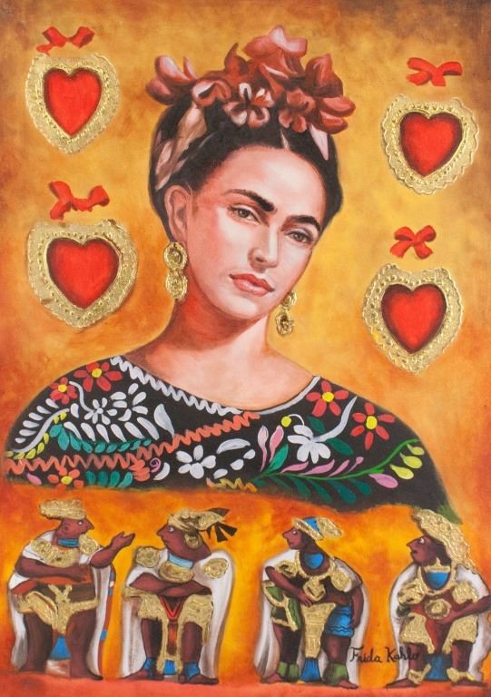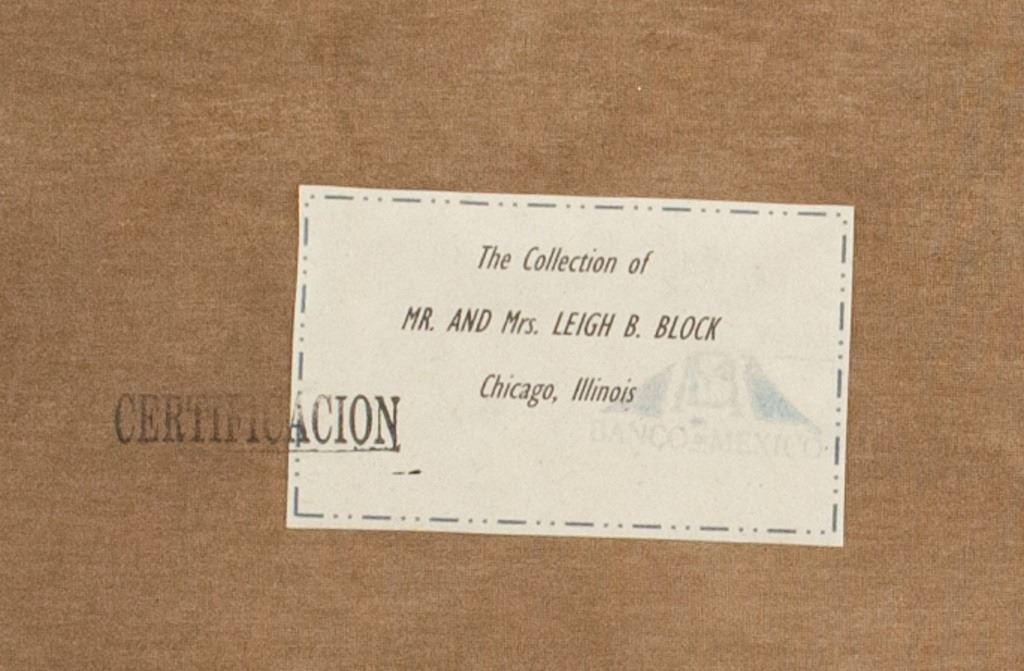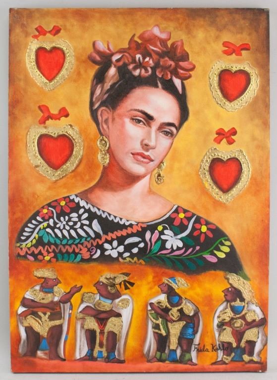 Oil on canvas. Featuring portrait of Frida Kahlo with four figures beneath and four hearts around. Signed "Frida Kahlo" to the bottom right corner. Label on verso reads "FROM THE GALLERIES OF ASSOCIATED AMERICAN ARTISTS". Second label on verso reads "The Collection of Mr. AND Mrs. LEIGH B. BLOCK Chicago, Illinois". Stamped with "CERTIFICACION". 71 x 50 cm (28 x 19.5 inches).