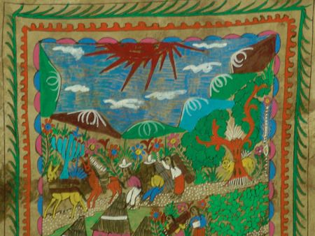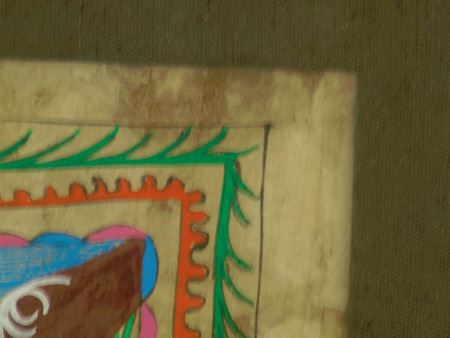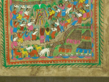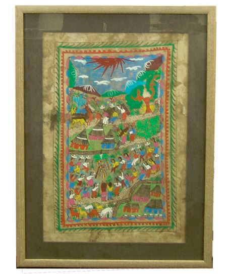 Mid 1900s, Colorful pen and poster paint scene of a busy Mexican community done on hand pressed marbled paper. Very good condition. 21" x 14" (26" x 19" framed)