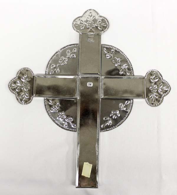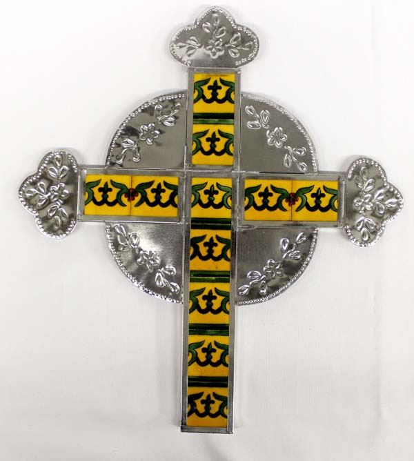 Mexican Pierced Tin and Tile Cross, measures 17'' x 15'' x .5''H