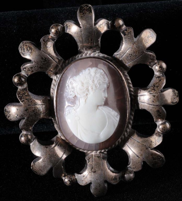 Description Marked "Far Fan 925". Pin-back pin but can also be worn as a pendant. Several cracks in cameo, mostly peripherally, and none through the white carving. Condition (Very Good - Excellent). Size 3" L.