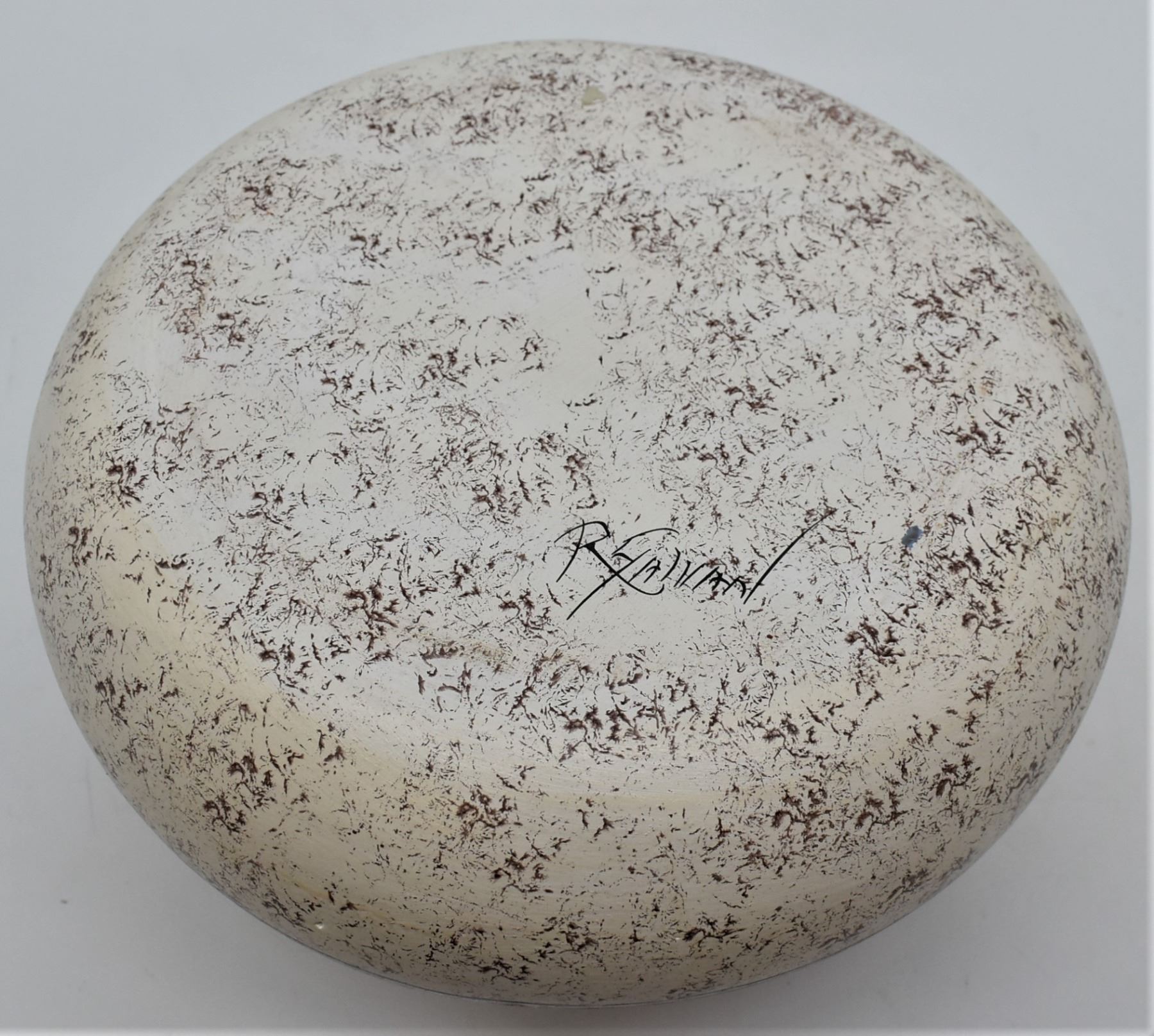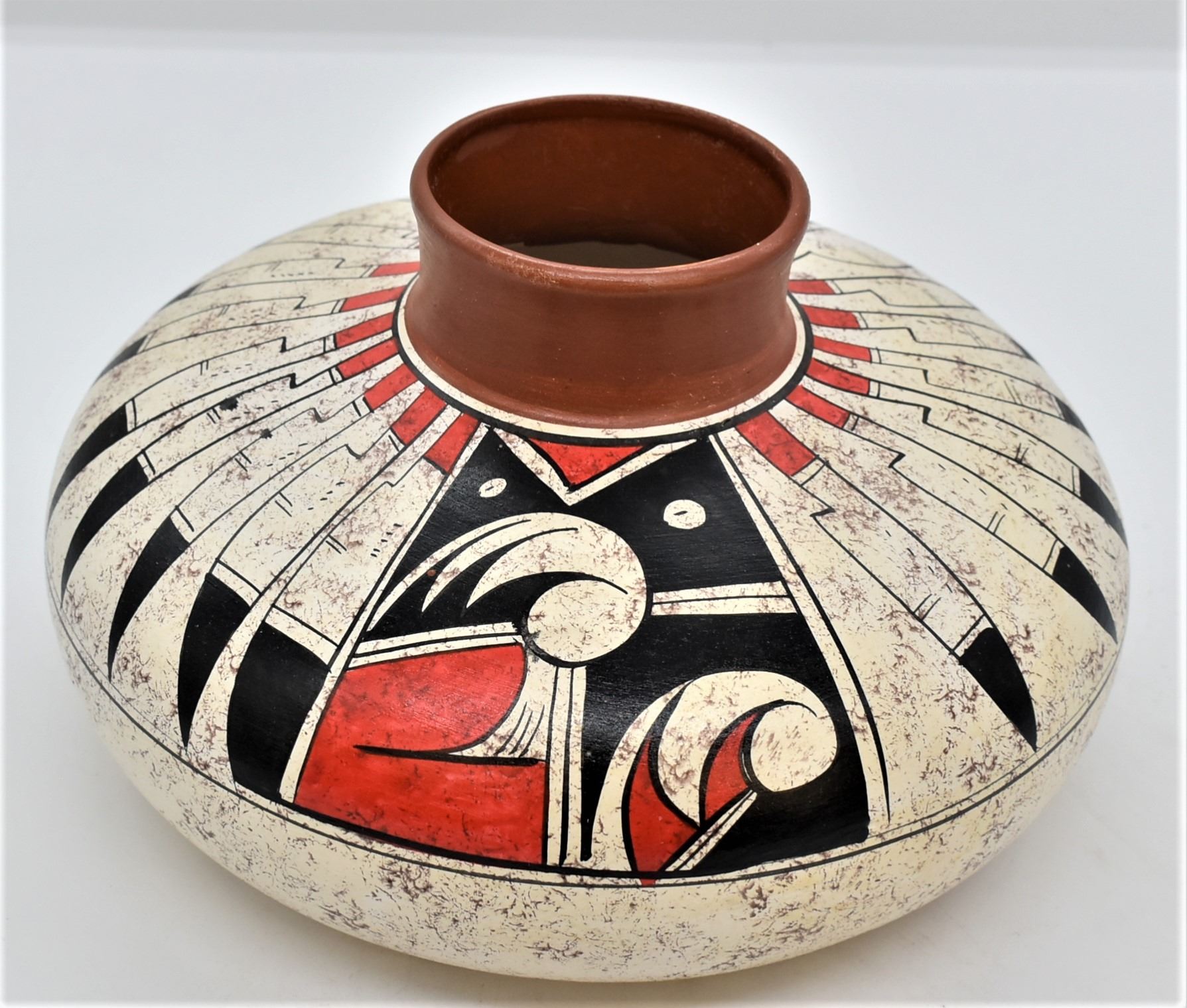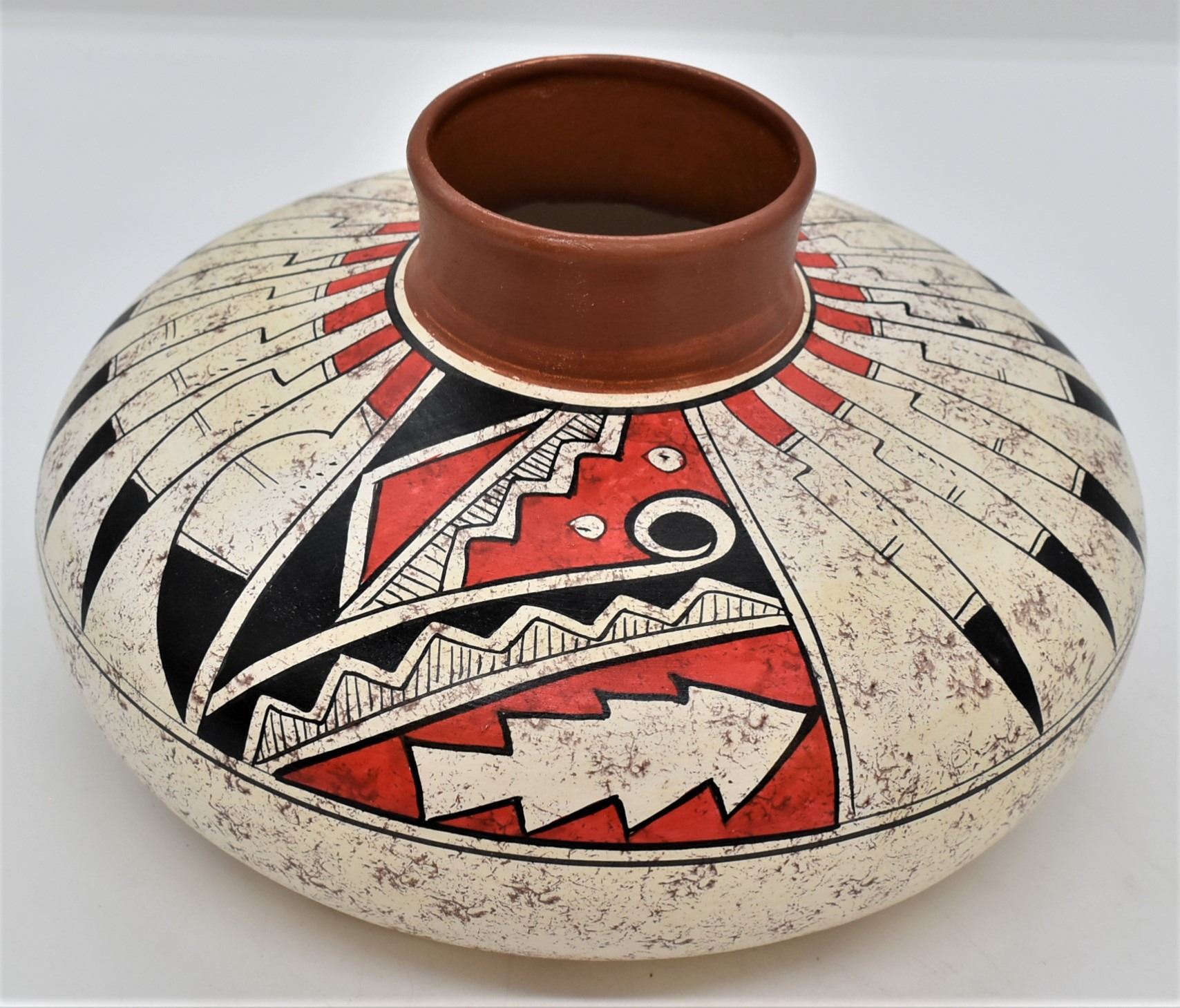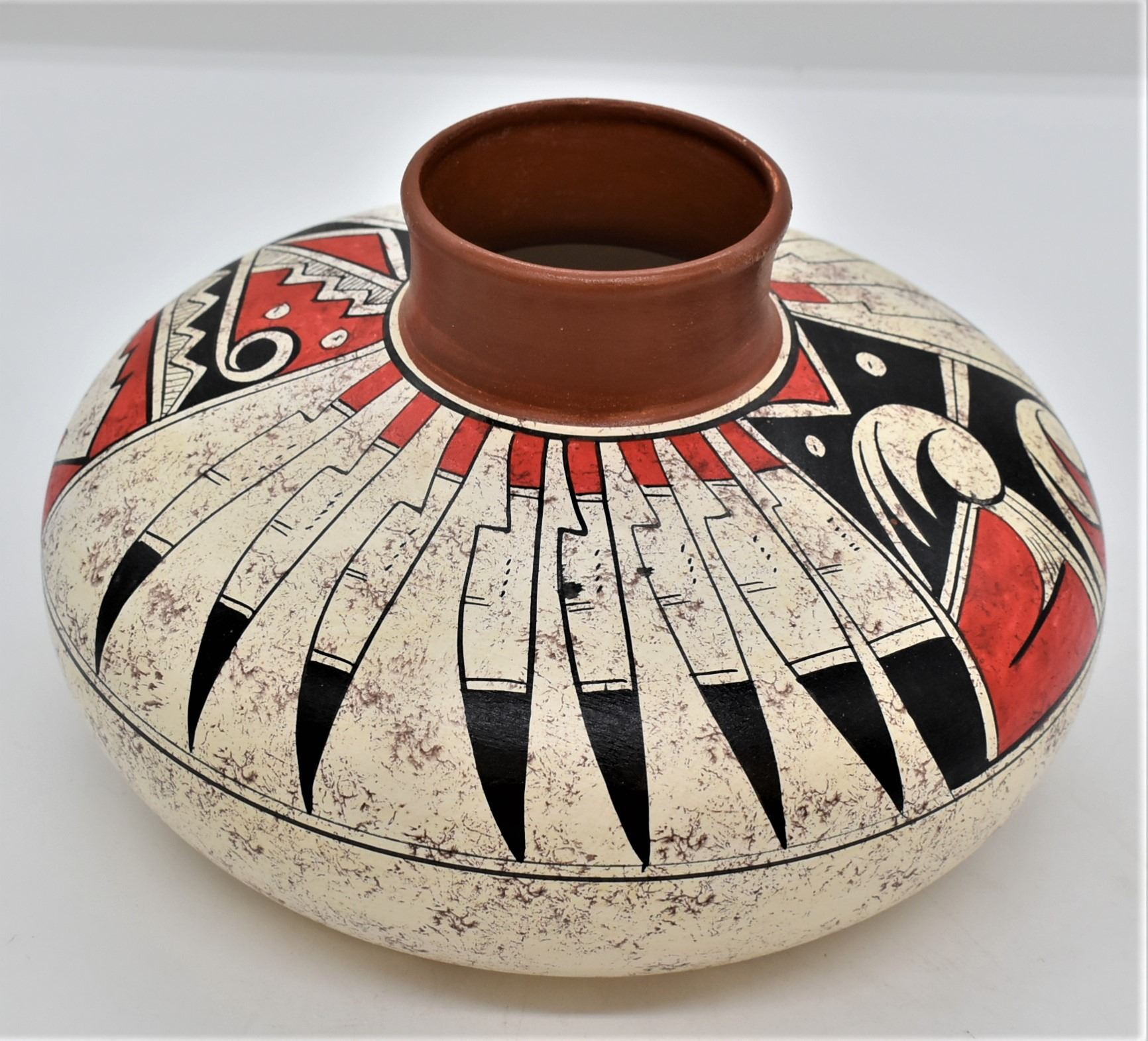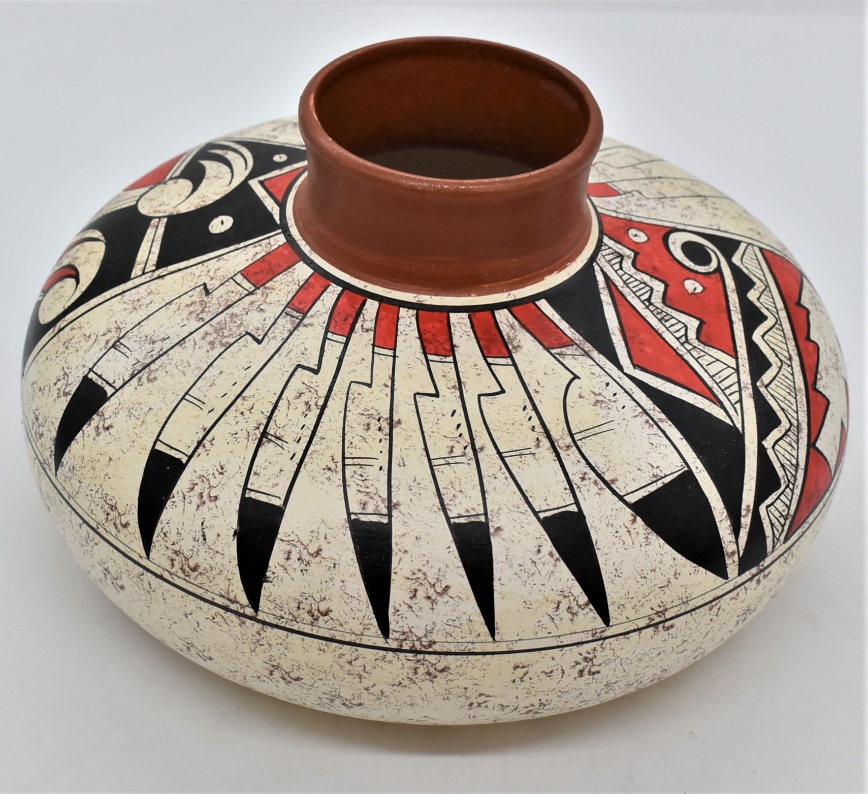 Mexican Polychrome Pottery Bowl by R. Galvan, measures 7'' x 10'' and is signed on the bottom, hand painted, deceased artist