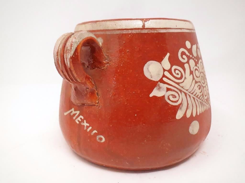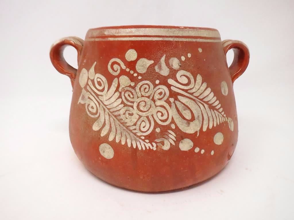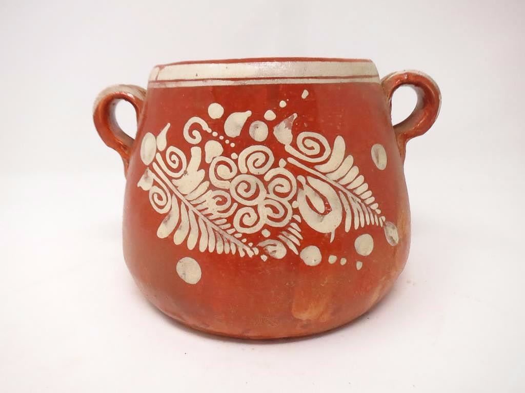Orange Glazed Medium sized pot with ivory colored floral pattern