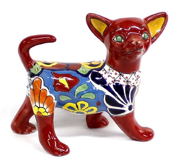 Mexican Pottery Chihuahua Dog, measures 8'' x 8'', beautiful colors, small repaired chip in right front paw