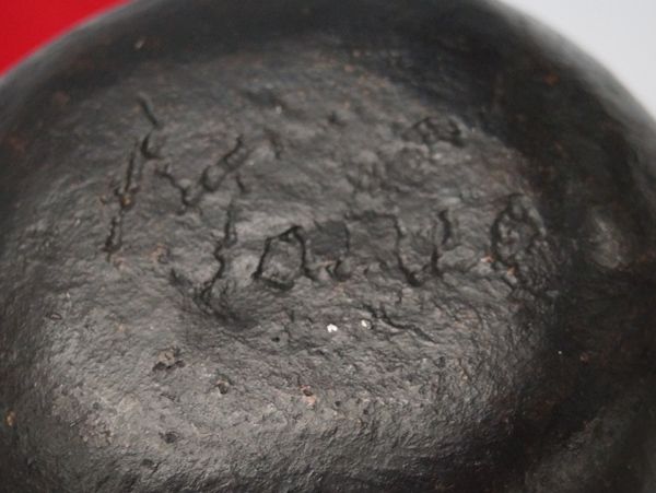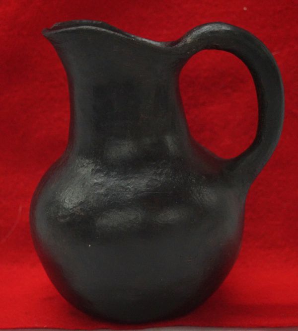 Mexican Pottery Pitcher by Marie, measures 6.5''H x 5.75''W, painted black, small chip on spout
