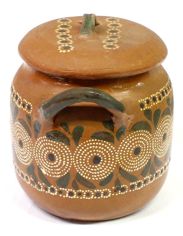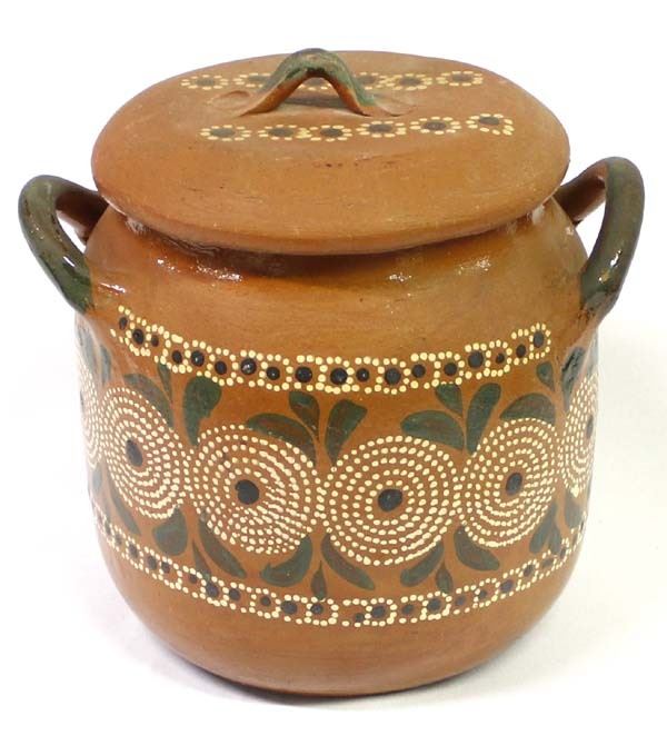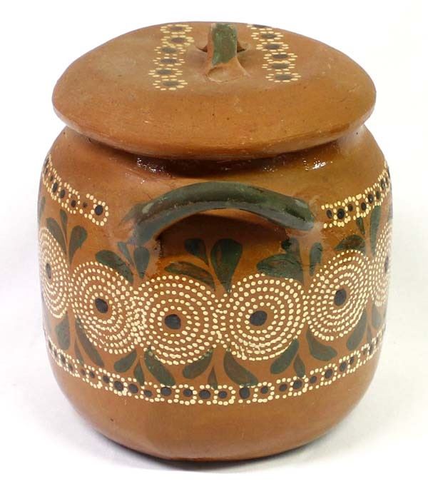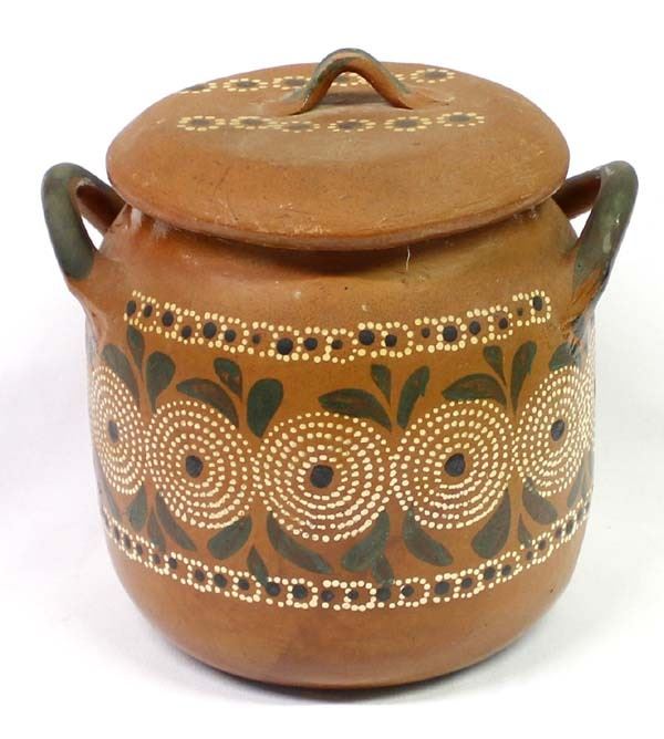 Mexican Redware Pottery Lidded Bean Pot, double handles, measures 9'' x 9''