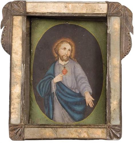 Mexican Retablo in Tin Frame. 12 ½” x 11" frame size. 10” x 7” painting. Shows traces of gold paint. 19th Century. Painting in good condition. (est $500-700)