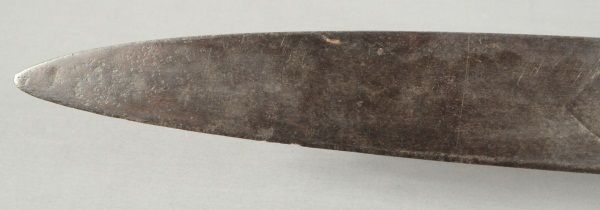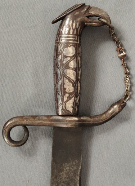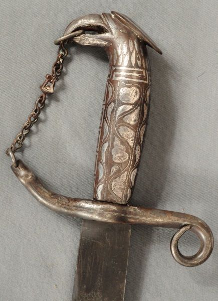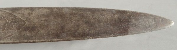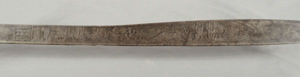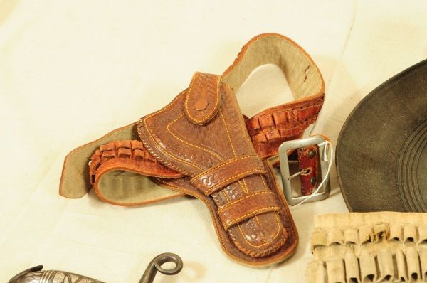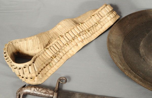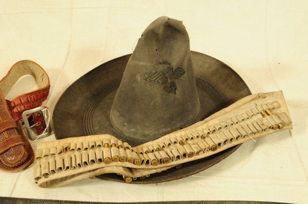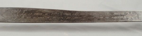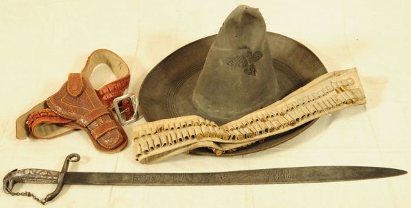 Ornate blade, reads: "La punta de esta espada, se anda paleando la muerte. A ver si lale un valiente, que quiera jugar con su suerte", also marked "Oaxaca Mexico D.L.B., blade measures 28" long, overall length 33". Eagle sombrero, bandelero belt, and gun belt with holster.