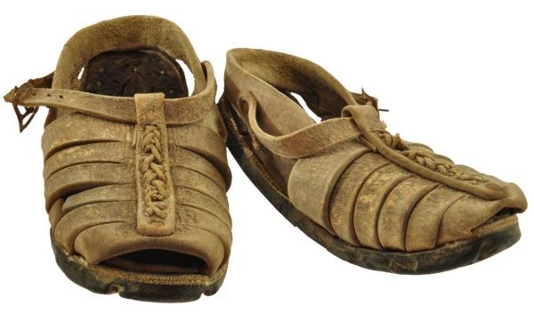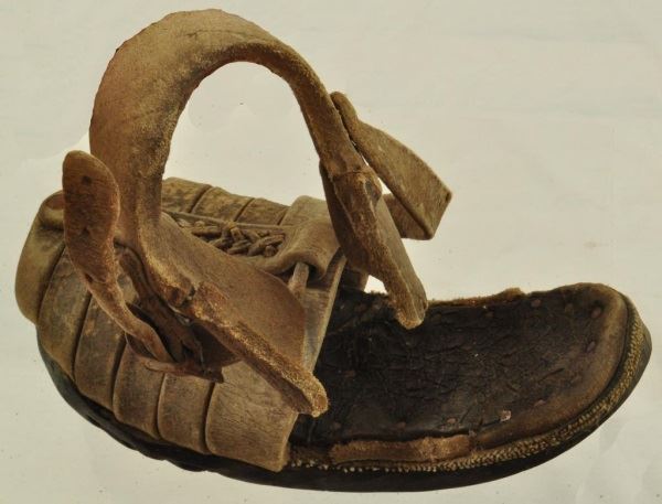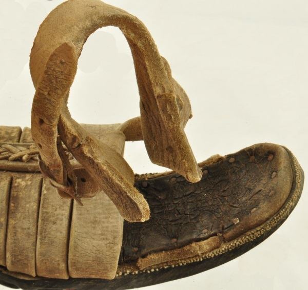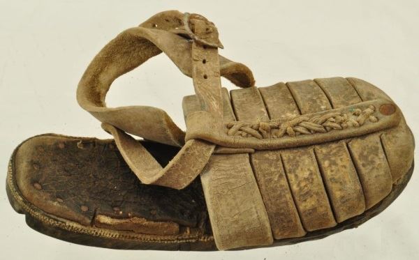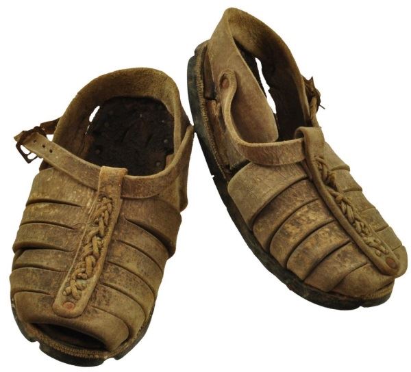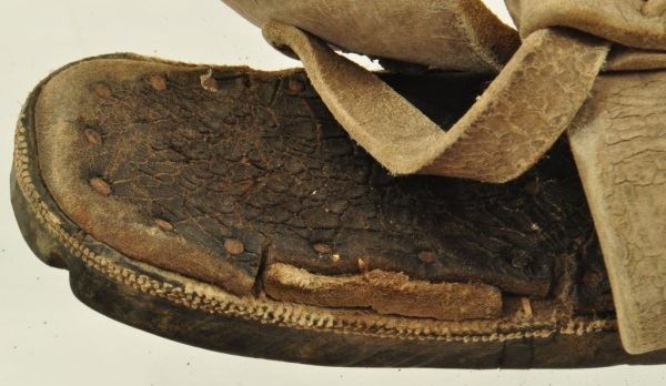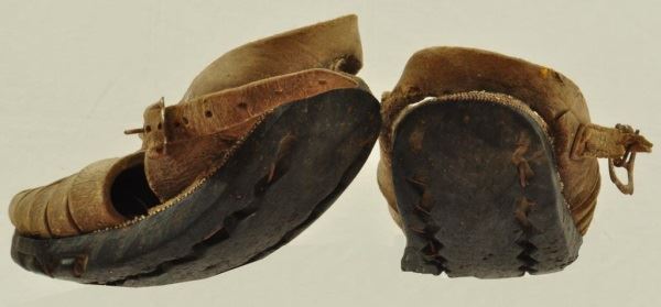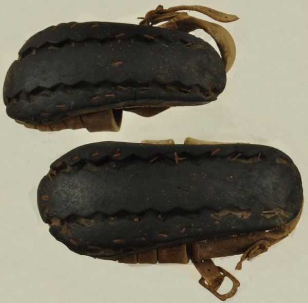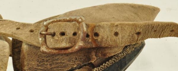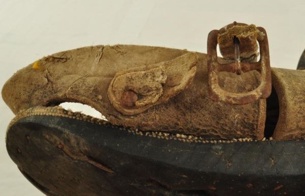 These interesting sandals typify the footwear of the ordinary rural revolutionary fighter. This pair recently brought out of Mexico is believed to have been made using U.S. Army early 1900's truck tires as soles. Car tires are still used today for peasant and migrants sandals. Other traits such as the early buckles indicate 1900's date for these Sandals are very well made and are in remarkable condition, showing much age only.