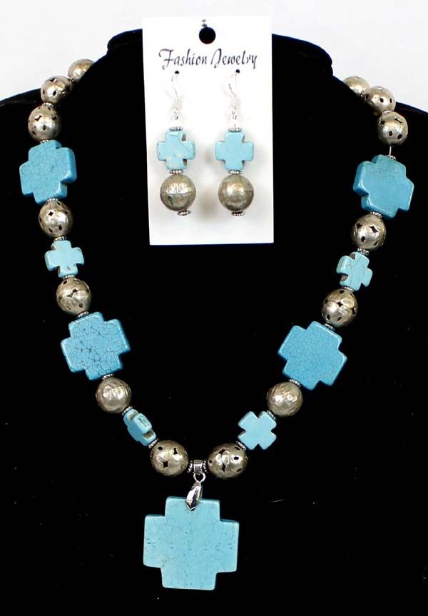 Quail Ridge Studios One of a Kind Mexican Sterling Silver and Magnesite Cross Earrings and Necklace by Larry McLellan. The necklace is 20'' end to end and the earrings are 2'' in length. The magic of the Desert Southwest is timeless in its display of open landscapes, sunrise and sunset colors with infinite possibilities of artistic expression. The design studio of Quail Ridge was founded on these possibilities, forging an endless variety of earthen gems to their metallic counterparts. The artist, Larry McLellan, designs jewelry contemporary in style, while maintaining elements of native designs.