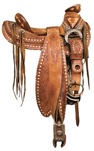 Mexican Saddle. Ornately inlaid wood tree and fine tooled leather. Has silver inlaid stirrups, cinch ring and conchos. circa 1930s. Fine condition. (est $2,000-3,000)