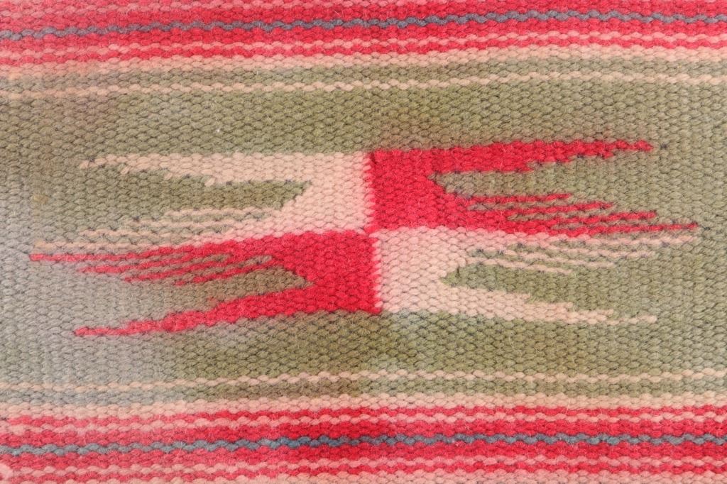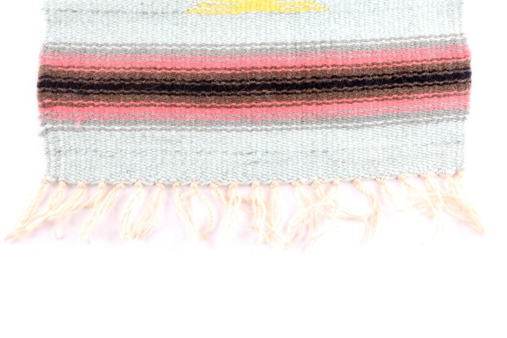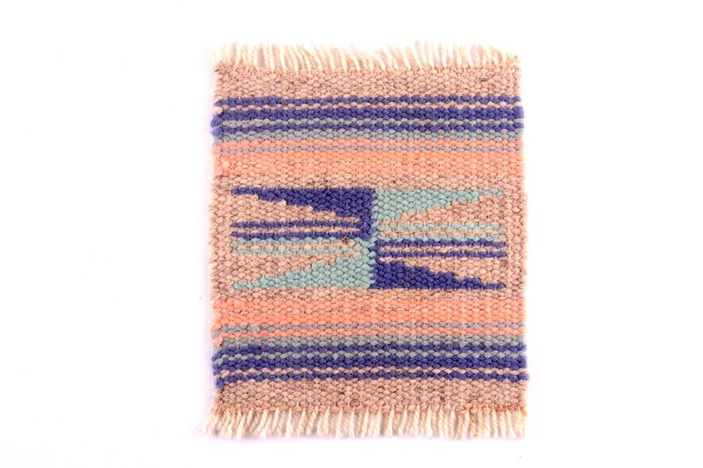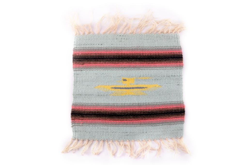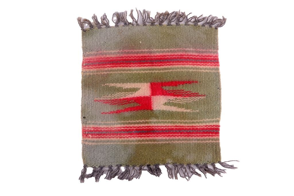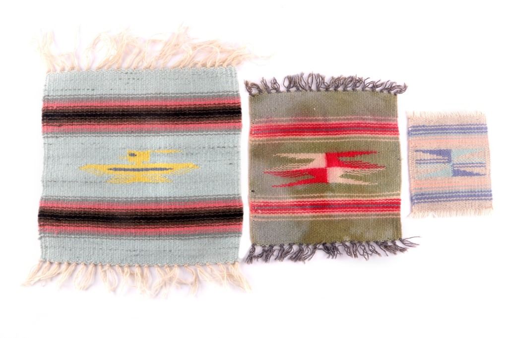 The lot features a circa 1940-1950’s Mexican Saltillo salesman sample weaving collection of three pieces. There are three salesman samples in this collection. The first is the largest and shows a lovely Saltillo banded rug example with blue, brown, salmon pink, and grey bands with a yellow thunderbird in the center of the rug. The second rug is a similarly banded Saltillo rug with a bluish field, banded red and darker blue, and a medallion in the center with checkered red and cream. The smallest of the salesman samples Saltillo shows a grey blue field with banded blue and light blue with pick; the medallion in the center shows checkered light and dark blue coloration. The measurements of these rugs range from 17" x 12 1/2" for the largest, 11" x 9 1/2", and 6 3/4" x 5 1/2" for the smallest.
