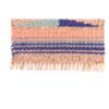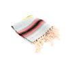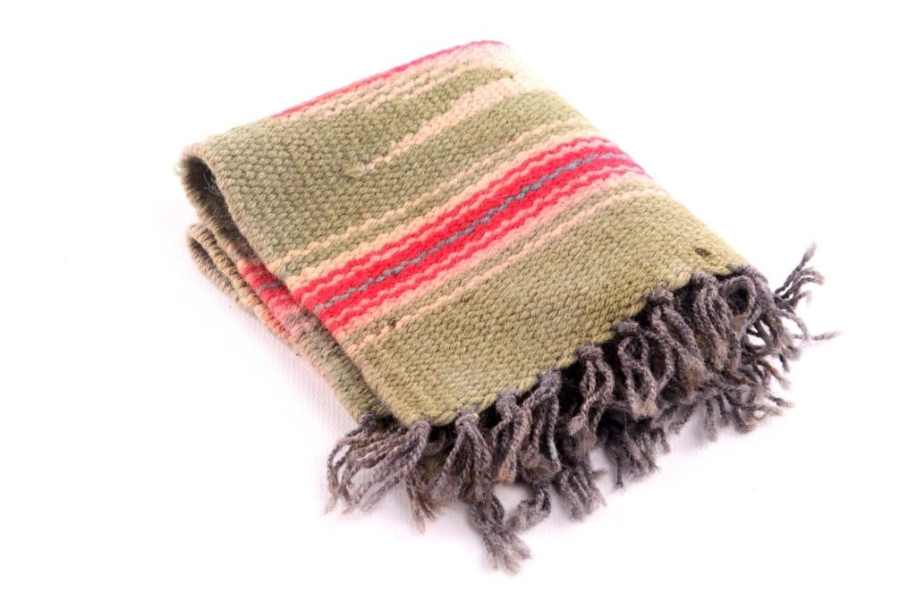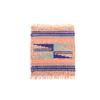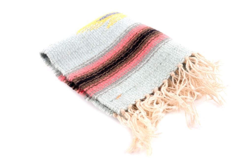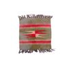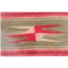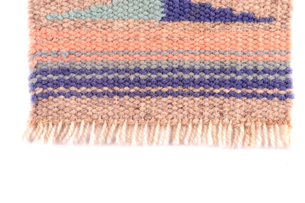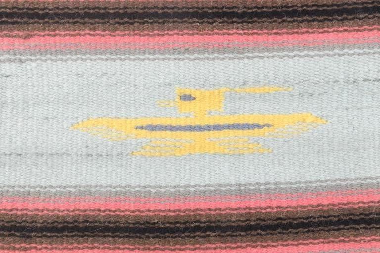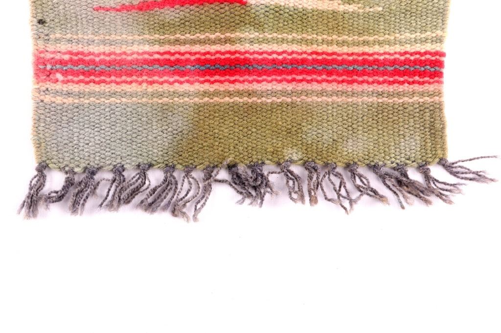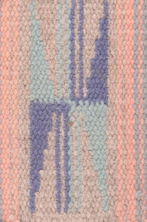 The lot features a circa 1940-1950’s Mexican Saltillo salesman sample weaving collection of three pieces. There are three salesman samples in this collection. The first is the largest and shows a lovely Saltillo banded rug example with blue, brown, salmon pink, and grey bands with a yellow thunderbird in the center of the rug. The second rug is a similarly banded Saltillo rug with a bluish field, banded red and darker blue, and a medallion in the center with checkered red and cream. The smallest of the salesman samples Saltillo shows a grey blue field with banded blue and light blue with pick; the medallion in the center shows checkered light and dark blue coloration. The measurements of these rugs range from 17" x 12 1/2" for the largest, 11" x 9 1/2", and 6 3/4" x 5 1/2" for the smallest.