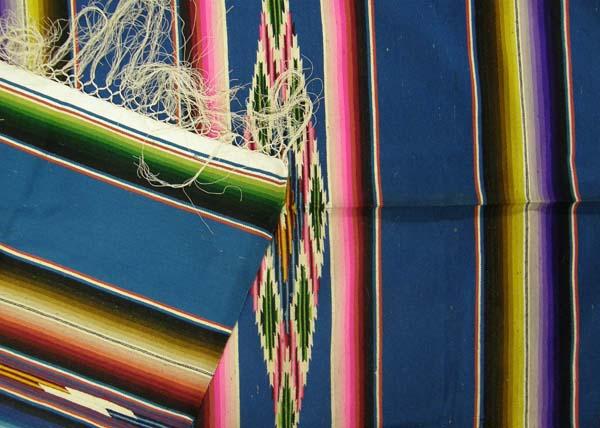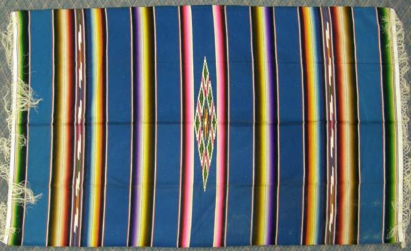 Mexican Saltillo Textile, rainbow colors. Measures approx. 88'' x 52''. W/O fringe. SHI $25.