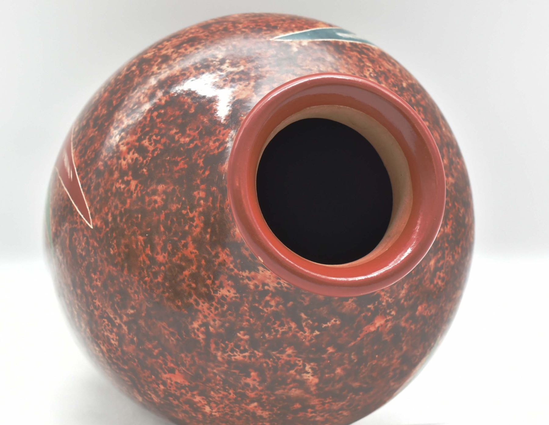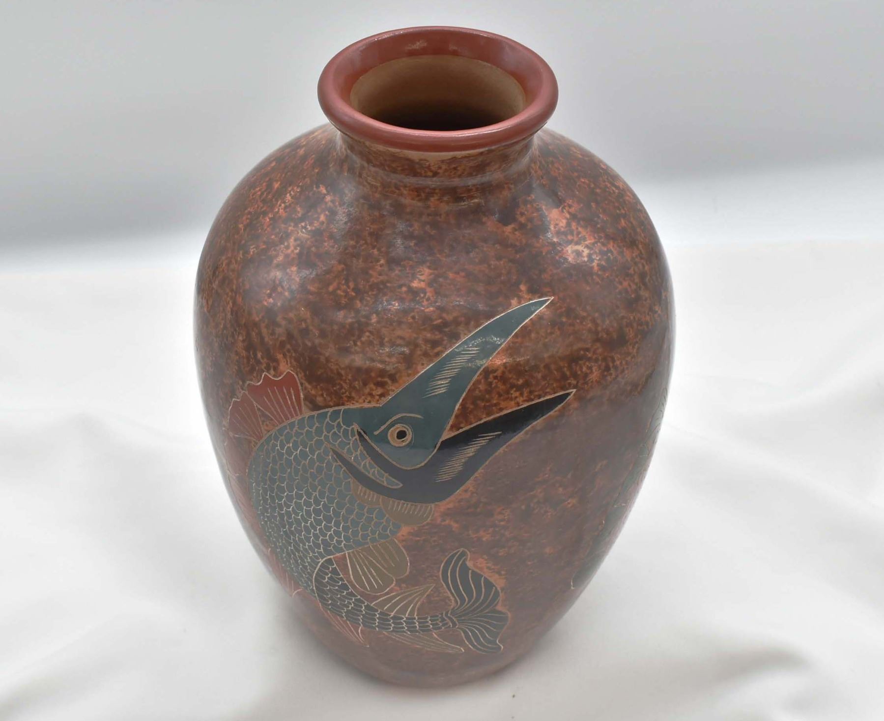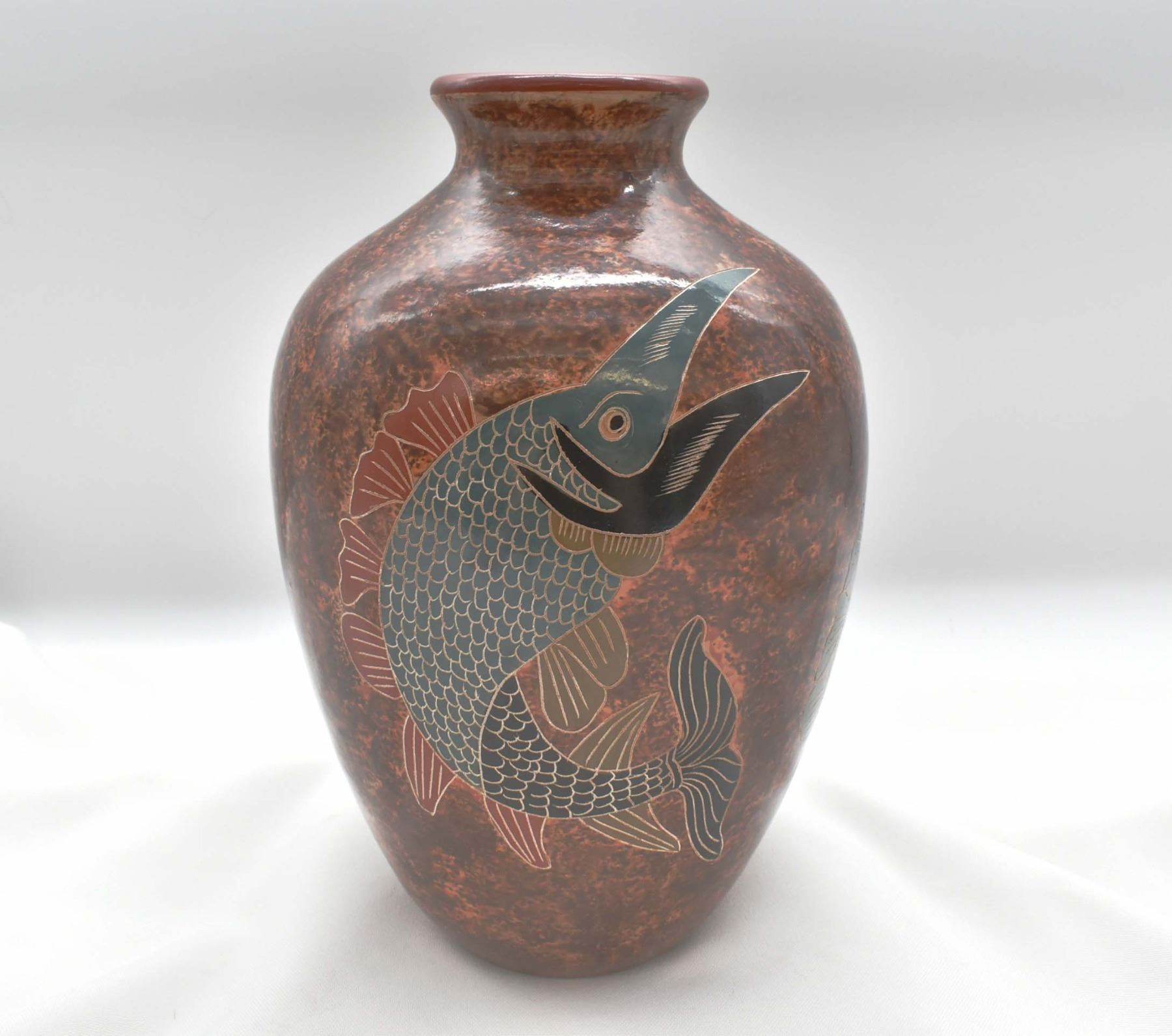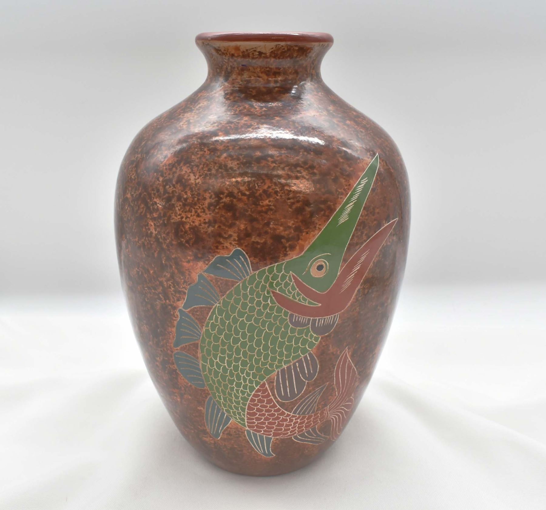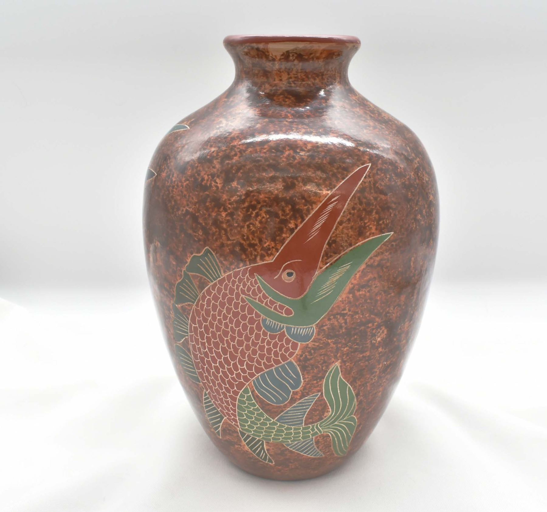 Mexican Sgraffito Sailfish Pottery Vase, measures 6" x 9.5", beautiful colors