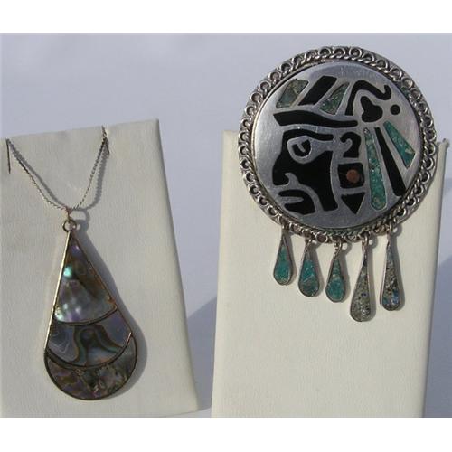 We present this wonderful pair of silver pendants for your consideration. One can be worn as either a brooch or a pendant. The other is a straight pendant. What wonderful character this brooch/pendant shows with its Aztec design of a god. Both are inlaid with various semi-precious materials including turquoise, and black ebony. The brooch also has a spot of copper worked in right below his ear. Five teardrops fall from this 2" diameter piece and each is also inlaid. Marked Taxco Mexico 925 it also has the eagle 3 stamp. In the center of the Taxco ring are the artist's initials but I cannot make them out because they are in script. On the pendant the chain is marked IBB, ITALY 925 and the pendant measures 2" in length.