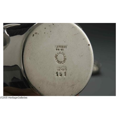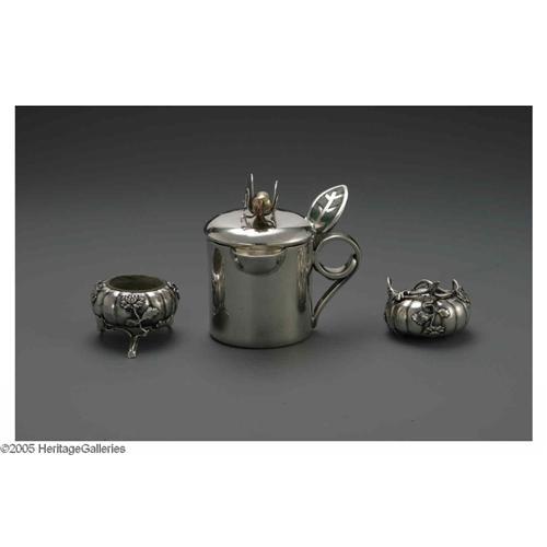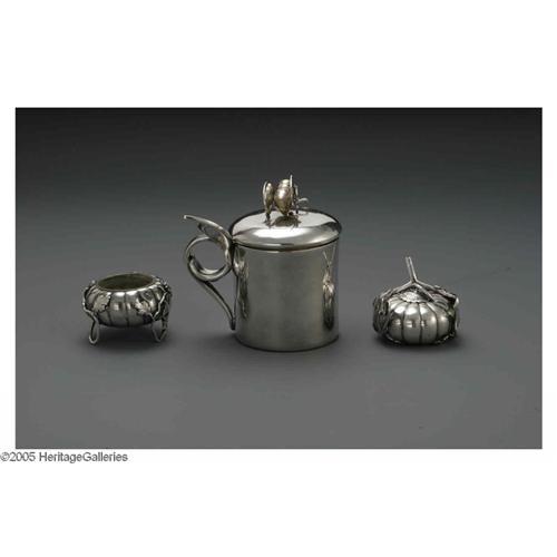 <B>A Mexican Silver Honey Pot and Open Salt and Pepper</B></I><BR>Mark of Los Castillo, Taxco, Mexico; and unknown maker, Twentieth Century<BR><BR>The Los Castillo honey pot with a mixed metal bee to the lid and stone to the leaf and handle, marked underside; a pumpkin form open salt and pepper, marked <I>STERLING</B></I><BR>The honey pot: 3.8in. high3 Items <BR><BR><B>Condition Report:</B> Normal signs of wear as appropriate with age; missing one tendril and leaf from the open salt.