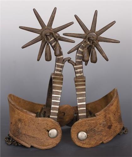 Mexican Silver Inlaid Spurs. 19th Century. Jingle bobs. 8 ½” long with Mexican straps. 8 point rowels. Good condition. (est $600-900)