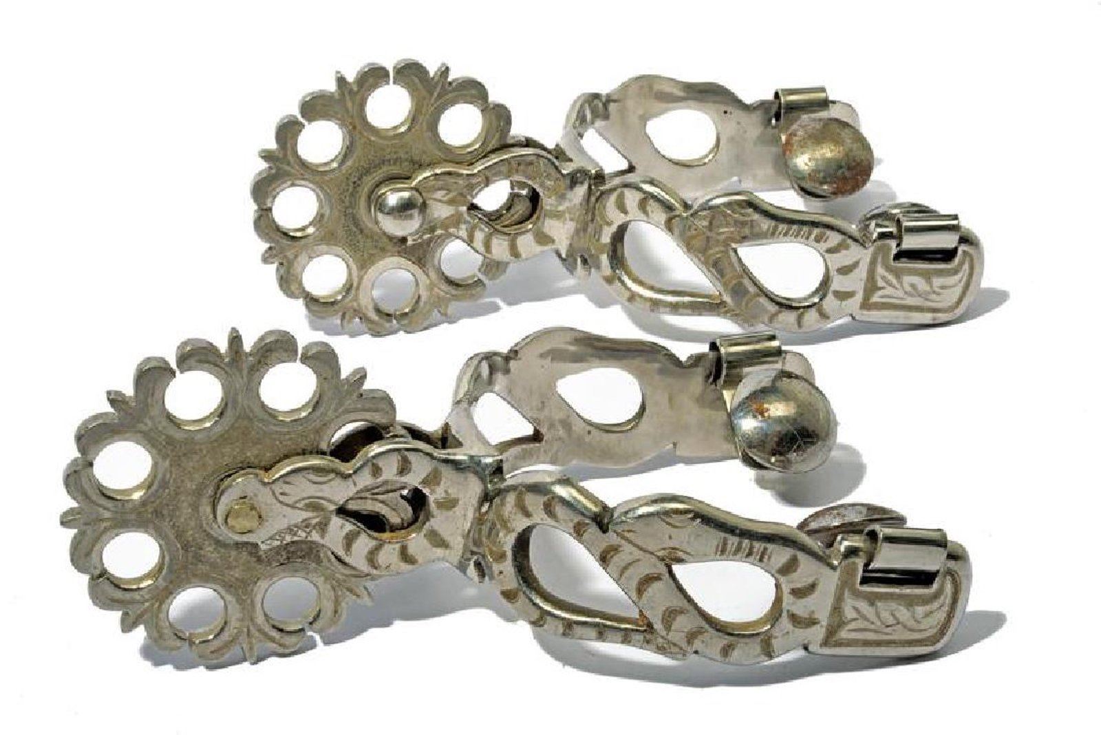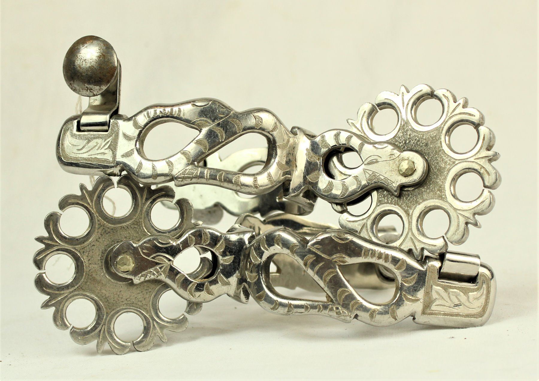 Unusual heavy figural snake spurs with engraved cut-out snakes on both sides, and complimented by fantastic large decorative rowels.