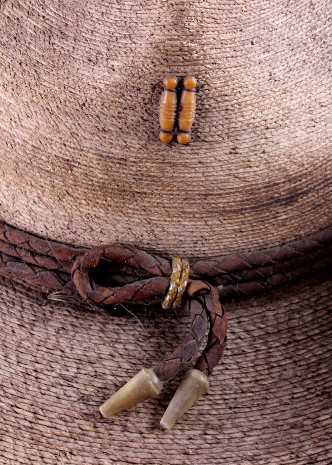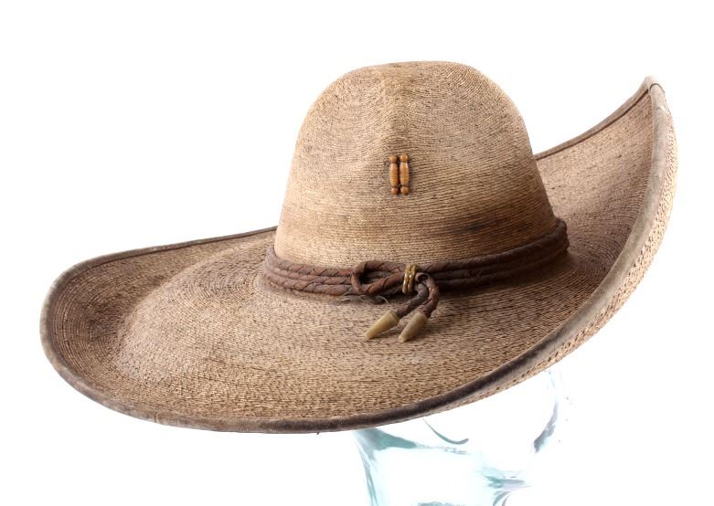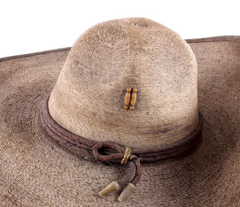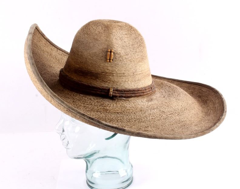 This is a Mexican sombrero. The sombrero is woven from natural fibers and features an upturned front. It has a braided leather hat band as well. The sombrero is in good condition. It is approximately size 7 and measures 20.5" in diameter.