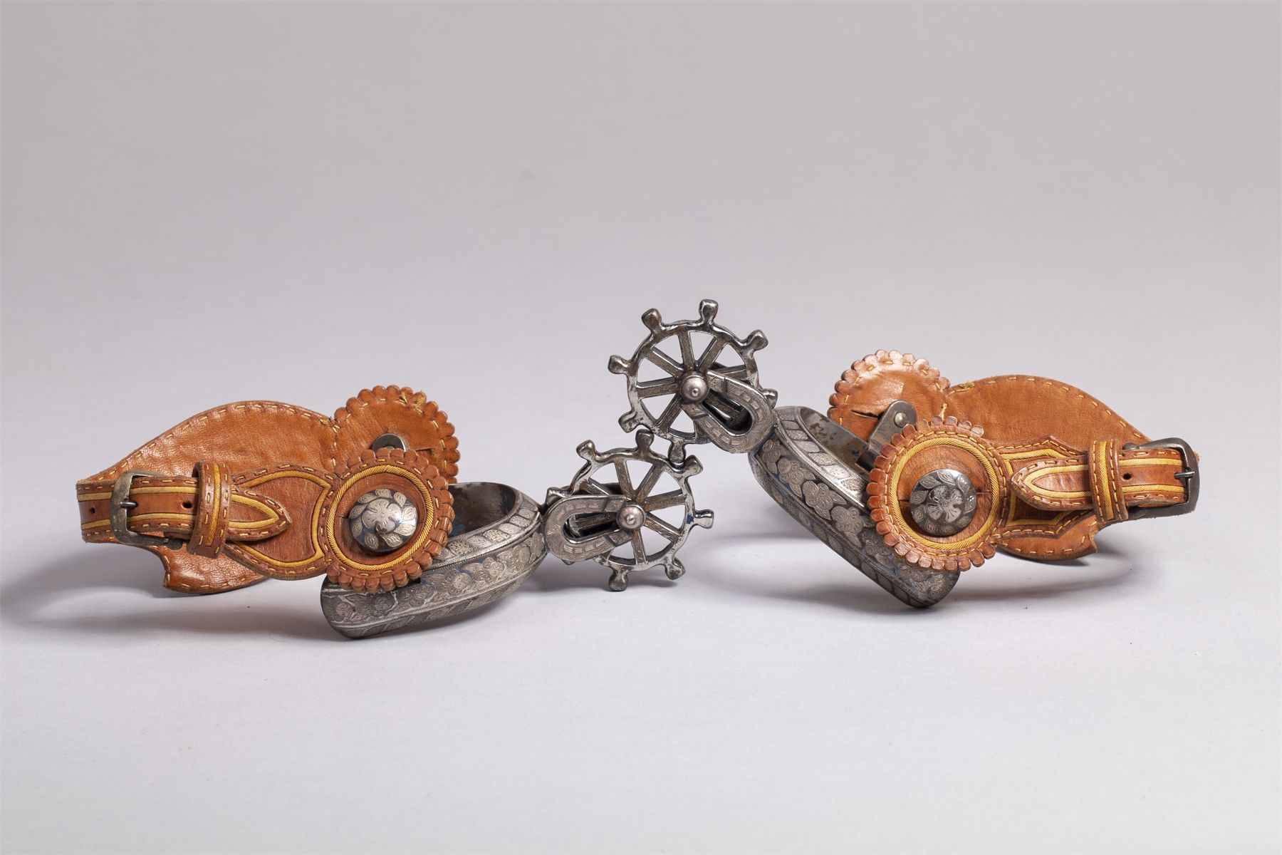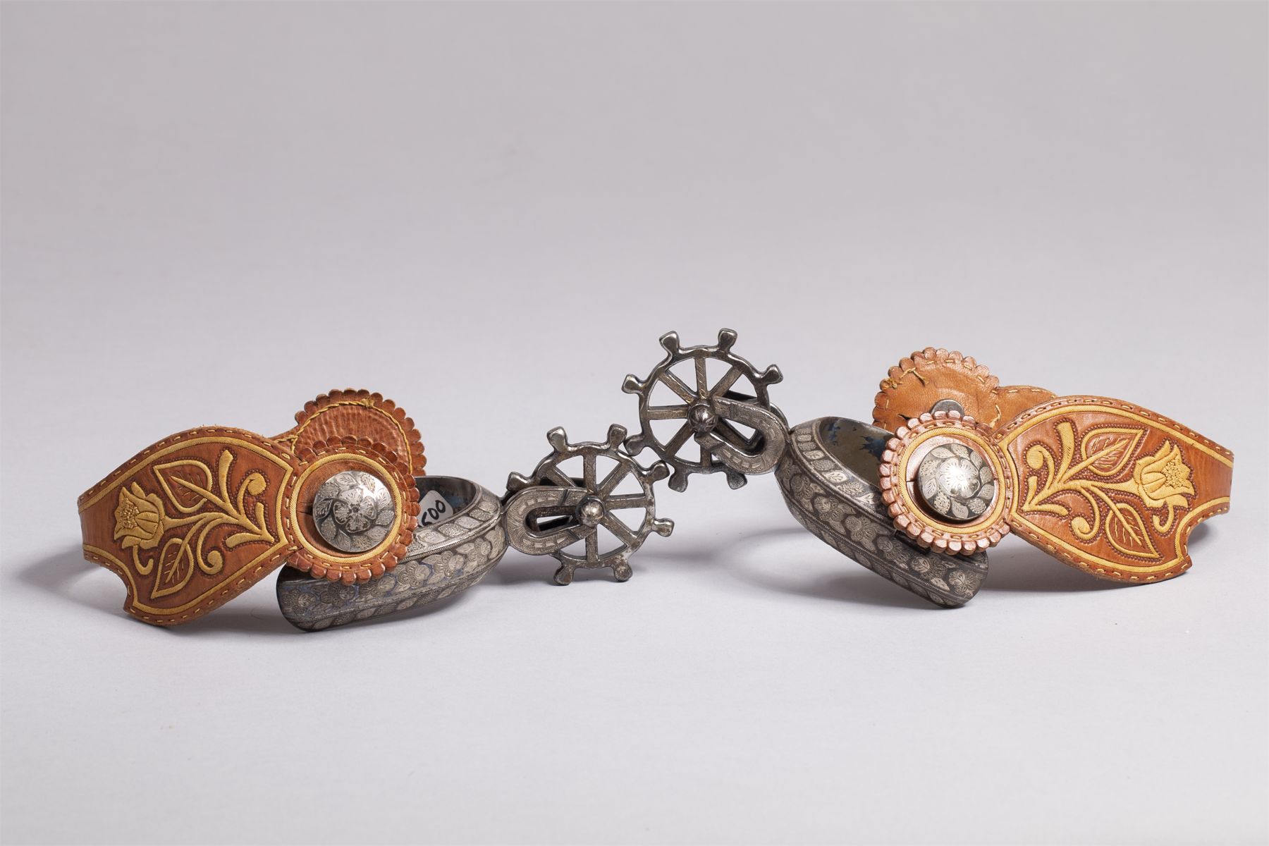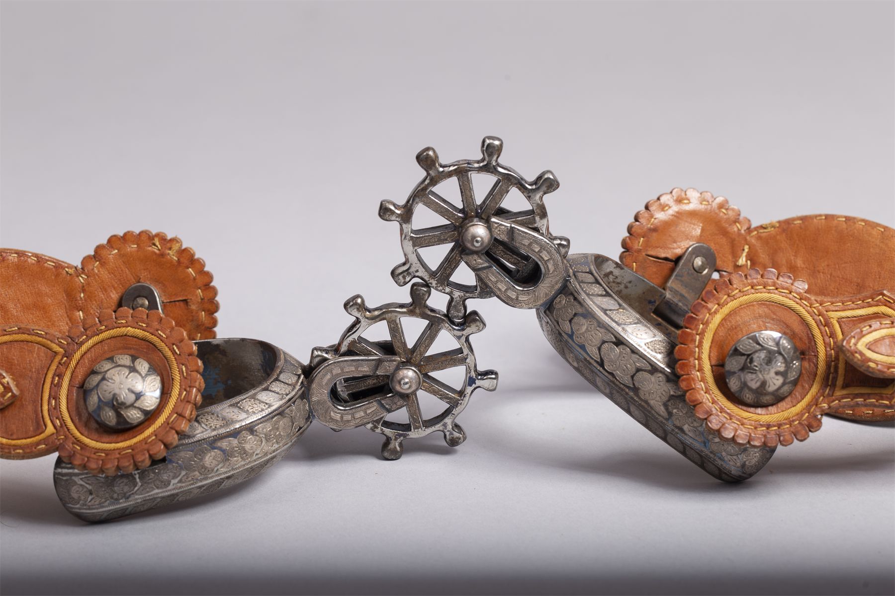 Mexican Spurs with Silver Inlays, Horseshoe Shank and Wagon Wheel Rowel