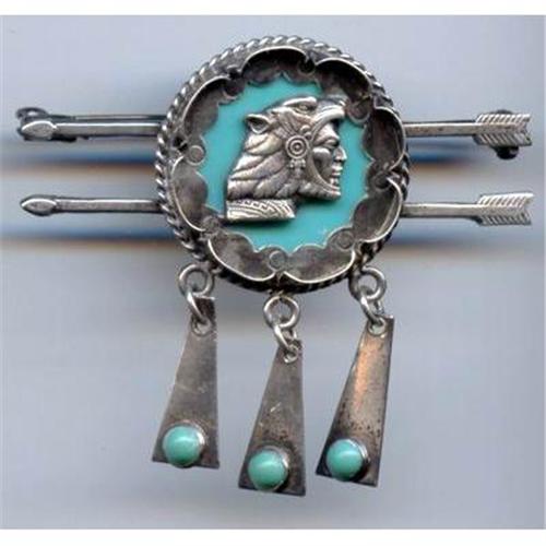 This interesting brooch measures 2 1/4" wide and 2" high. It features a fierce-looking Aztec warrior wearing a traditional Jaguar headpiece on a turquoise background. There are also turquoise cabochons set into the 3 dangles. The back is marked Mexico, Sterling and there is a c-clasp.