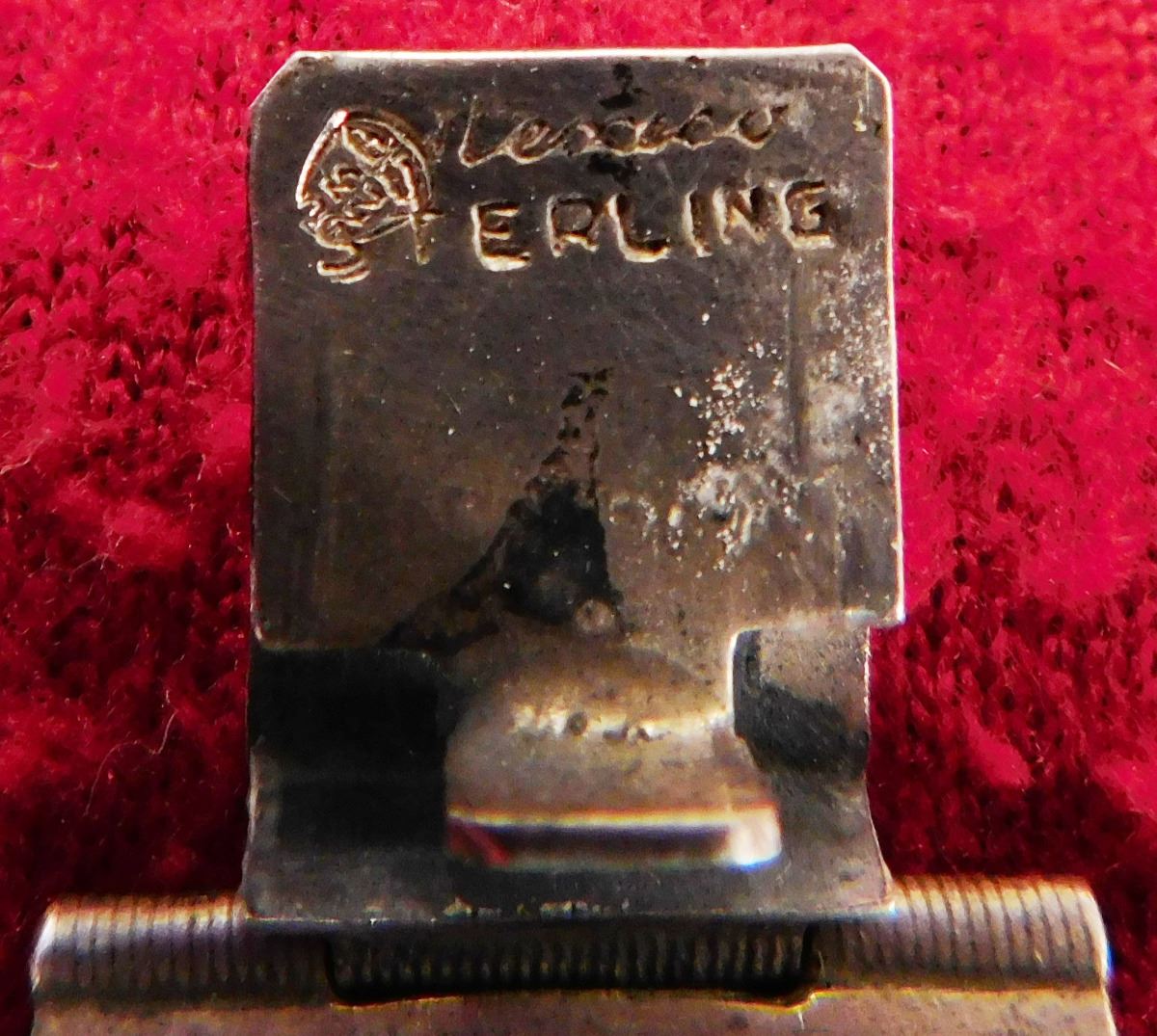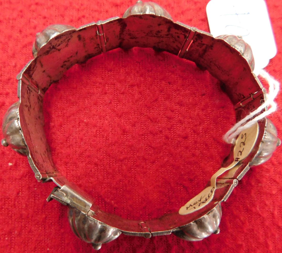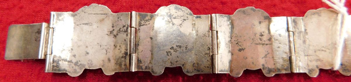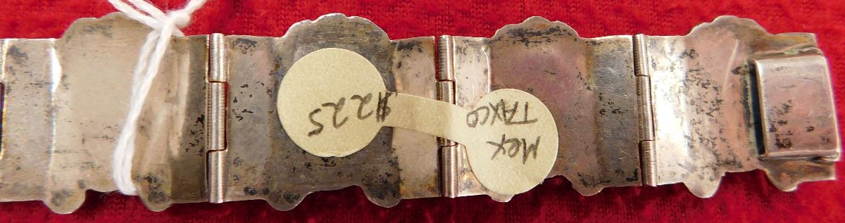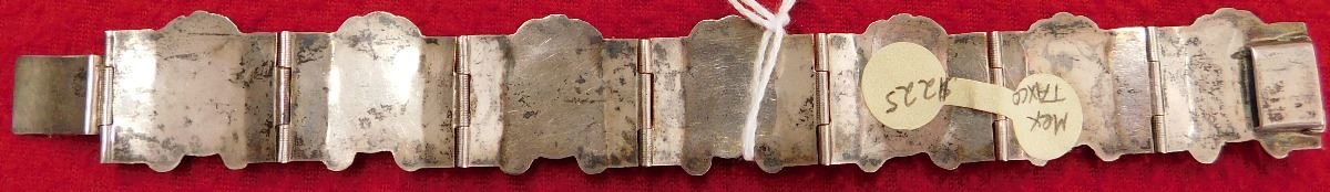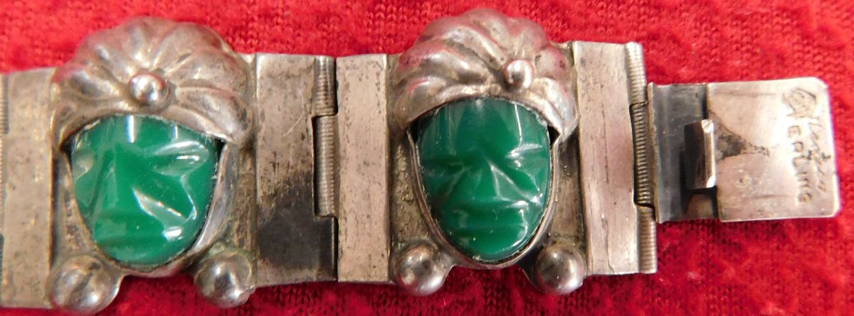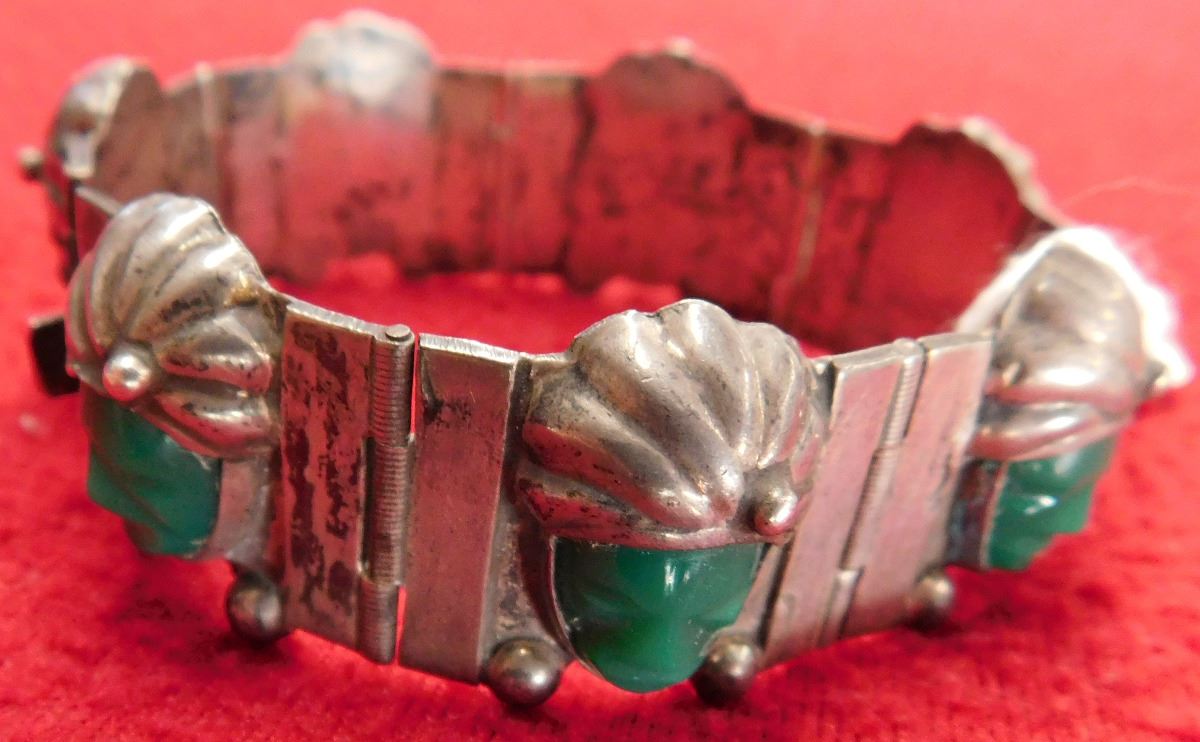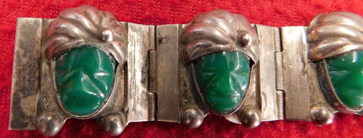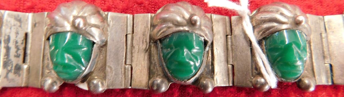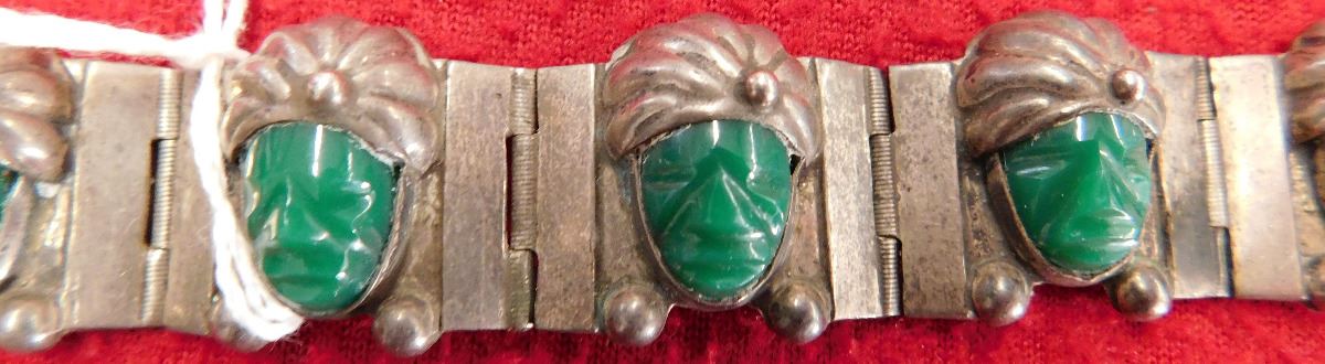 Mexican Sterling Link Bracelet, c. 1940s. Made of sterling silver and green glass, the item is 6.75" x 0.75". Mexico. Pre-Columbian head design carved green glass. Weighs approx. 37 grams. Condition: Well-worn, nice patina, see images. Shipping: $18.50 w/insurance and signature.