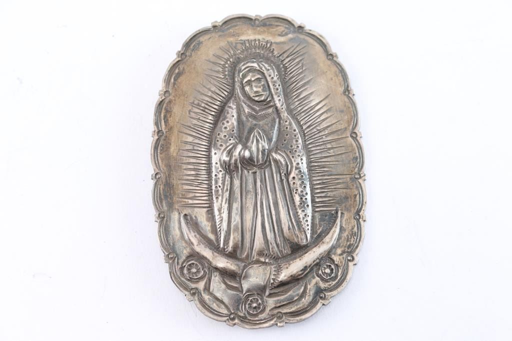 With a Virgin of Guadalupe motif. Weighs 36 grams. measures 3 1/2" x 2".