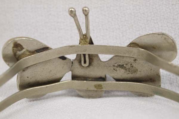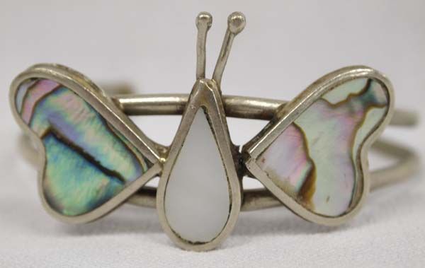 Mexican Sterling Silver Mother of Pearl and Abalone Inlay Butterfly Bracelet, inside measures 6.75'' which includes opening x 1''W, 18.7g in total wt.