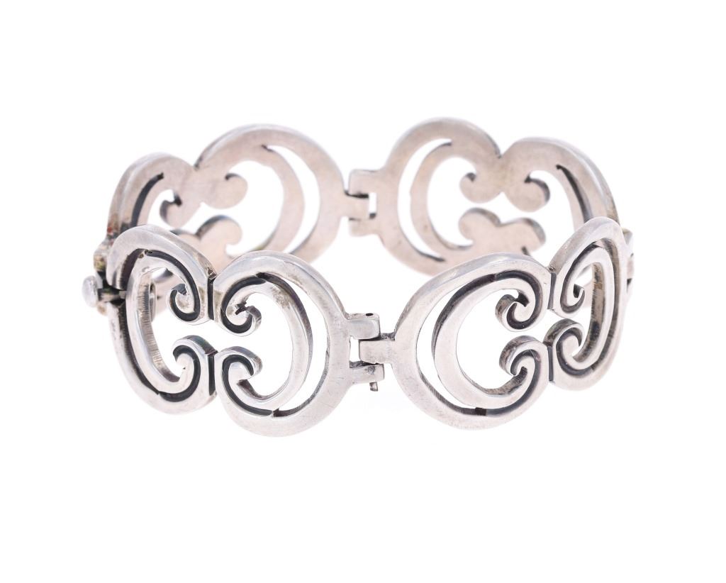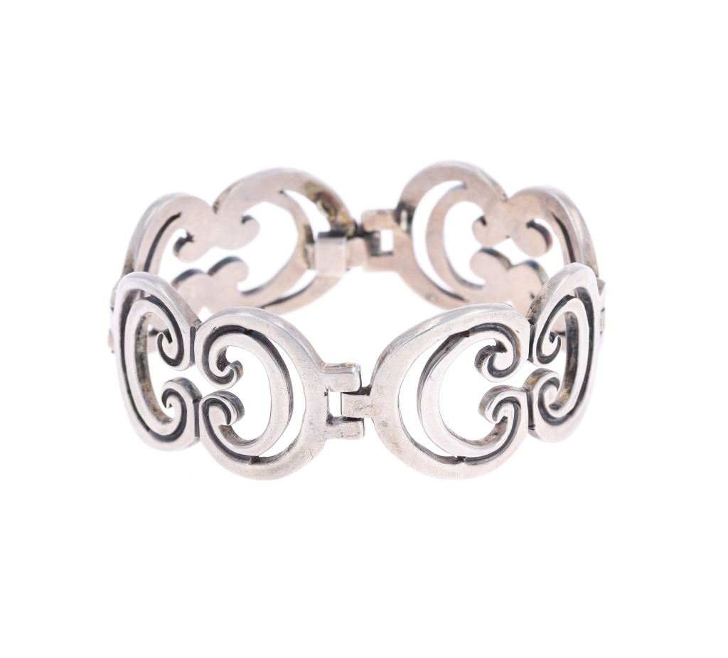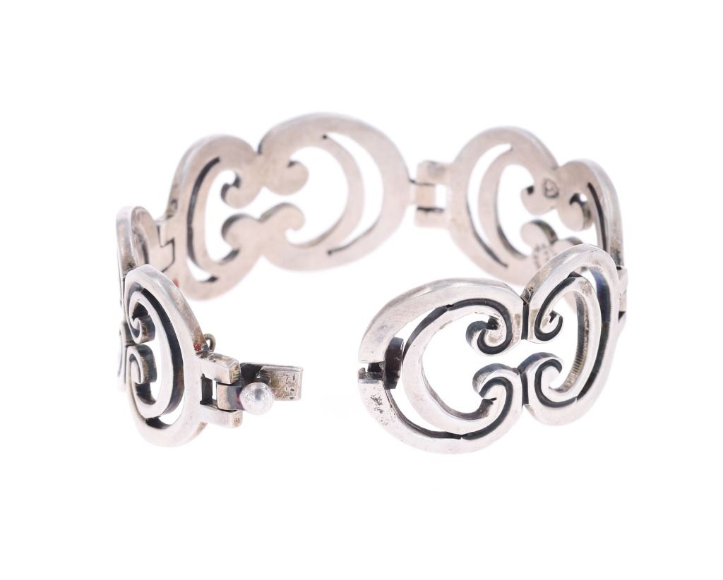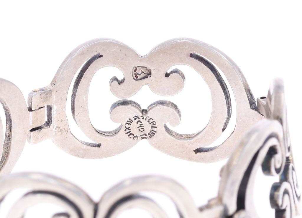 Featured in this lot is this Mexican sterling silver link bracelet circa 1960's. The bracelet features a wonderfully and professionally crafted sterling silver construction that shows a link design with conjoined 'C' decoration with tooled decoration. The bracelet is marked on the underside of the bracelet as follows: Sterling - Hecho en Mexico - and shows a pictomark with a (3 with a rocker above it). The condition of this Mexican bracelet is good with no obvious signs of damage and shows good overall condition. The overall measurements of this bracelet is 2 3/4" x 2 1/2" with the unclasp measurements from clasp to clasp is 7" x 1". The collective weight of this bracelet is 59.6g.