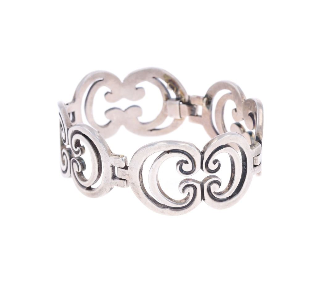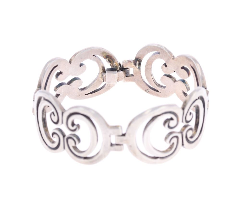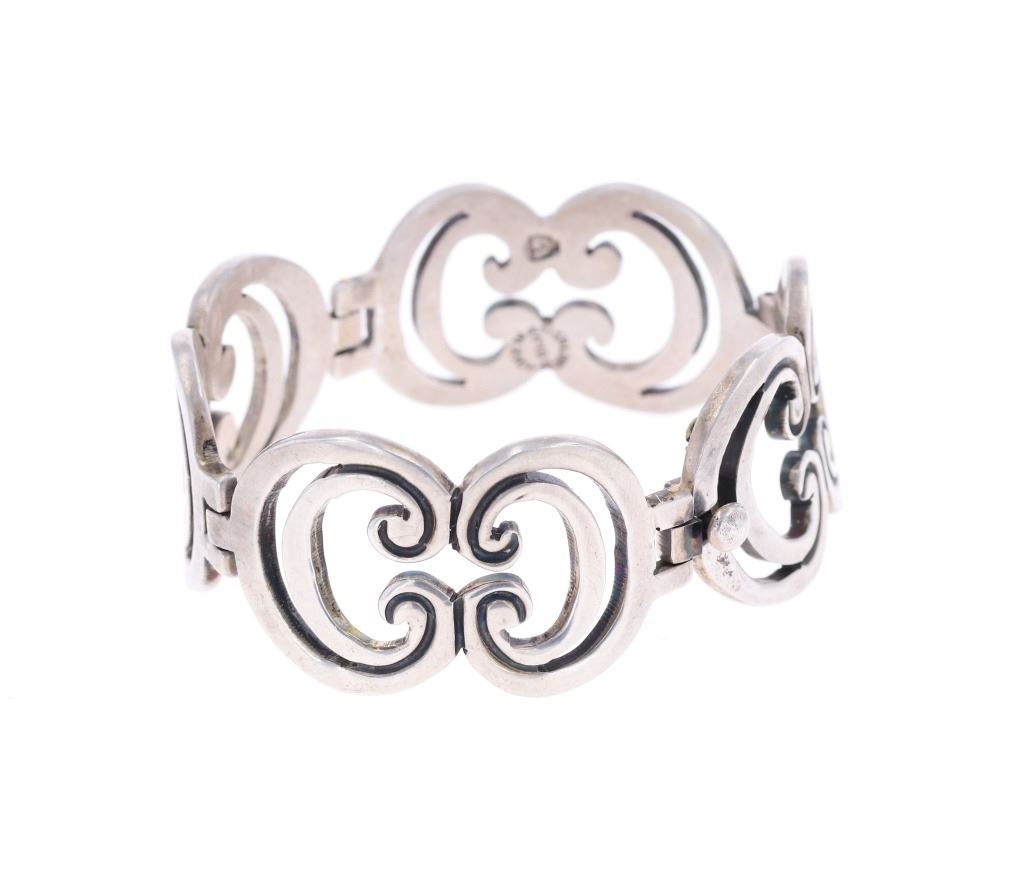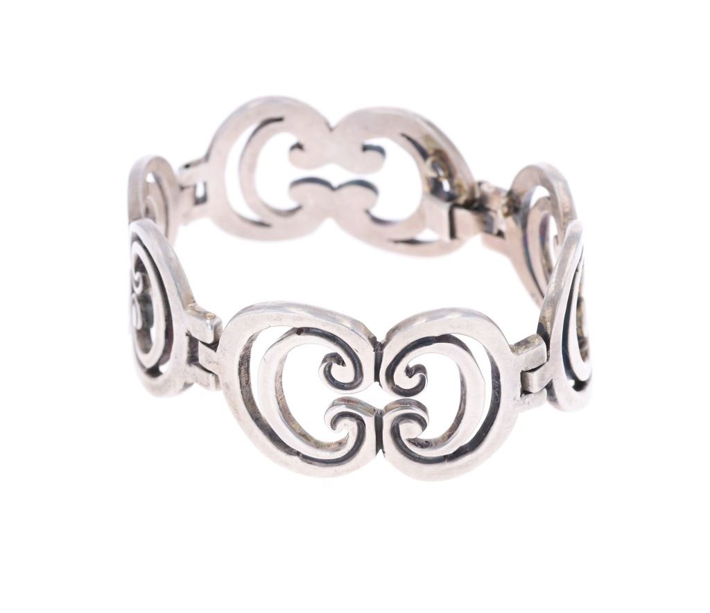 Featured in this lot is this Mexican sterling silver link bracelet circa 1960's. The bracelet features a wonderfully and professionally crafted sterling silver construction that shows a link design with conjoined 'C' decoration with tooled decoration. The bracelet is marked on the underside of the bracelet as follows: Sterling - Hecho en Mexico - and shows a pictomark with a (3 with a rocker above it). The condition of this Mexican bracelet is good with no obvious signs of damage and shows good overall condition. The overall measurements of this bracelet is 2 3/4" x 2 1/2" with the unclasp measurements from clasp to clasp is 7" x 1". The collective weight of this bracelet is 59.6g.