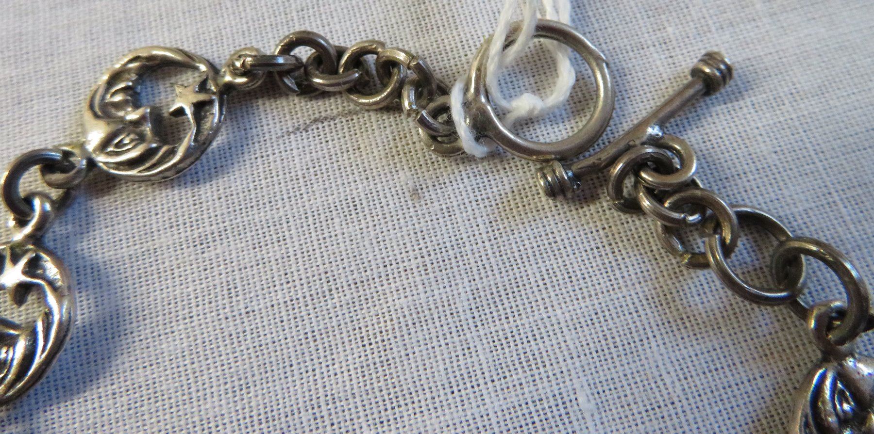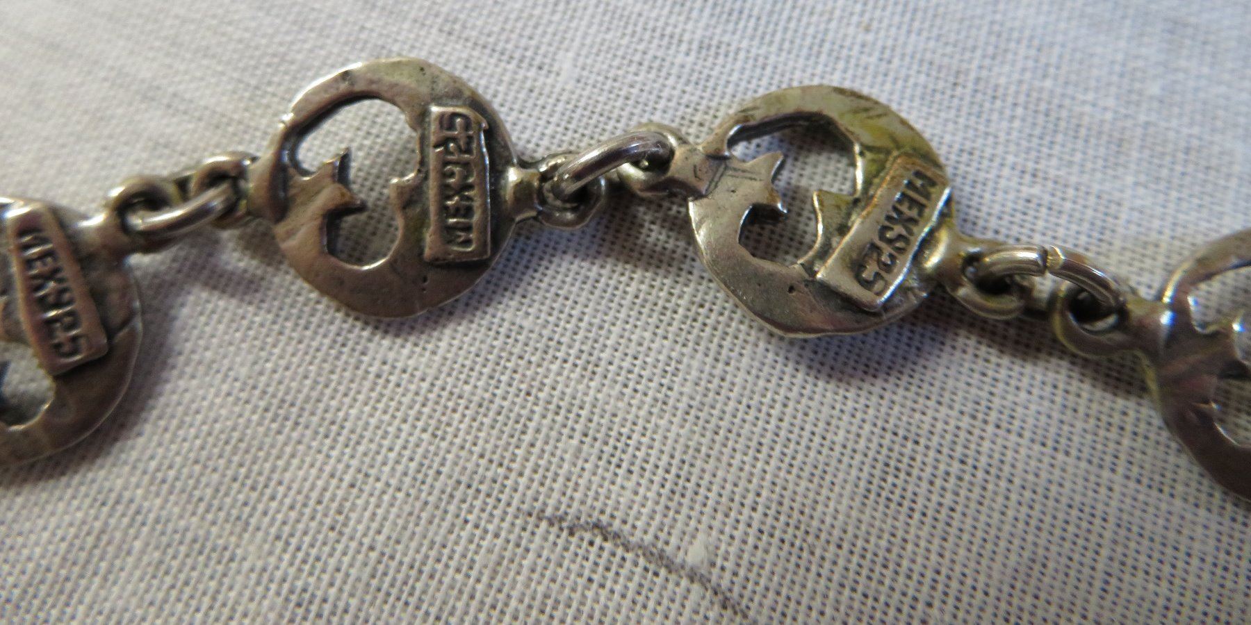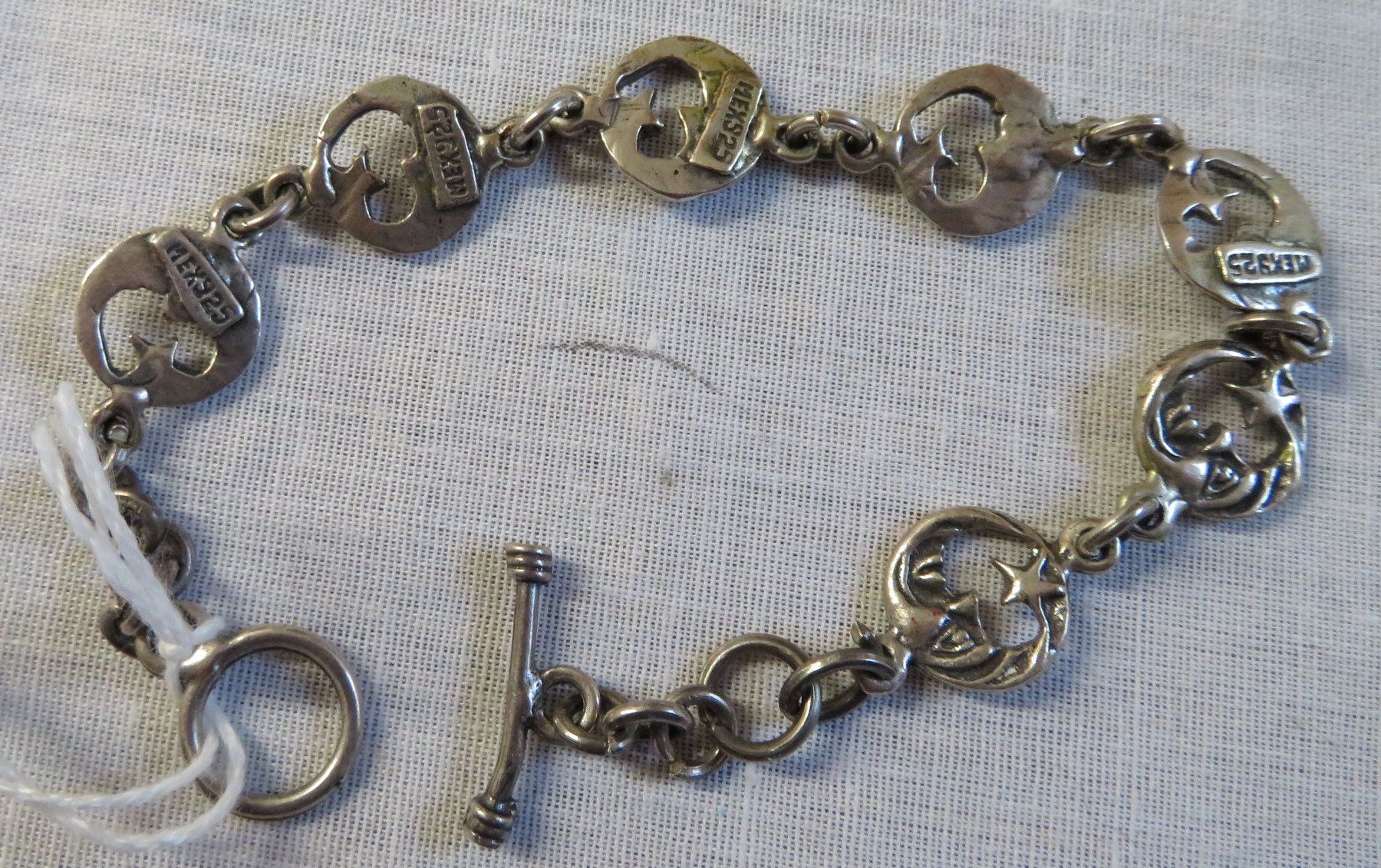 Mexican Sterling Silver Link Bracelet, c.1940s. Made of sterling silver, the item measures 6" x 2". Mex, 925. Weighs approx. 14.6 grams. Interesting bar and ring clasp, very fine piece of jewelry. Moon and star design. Condition: Good patina, see images.