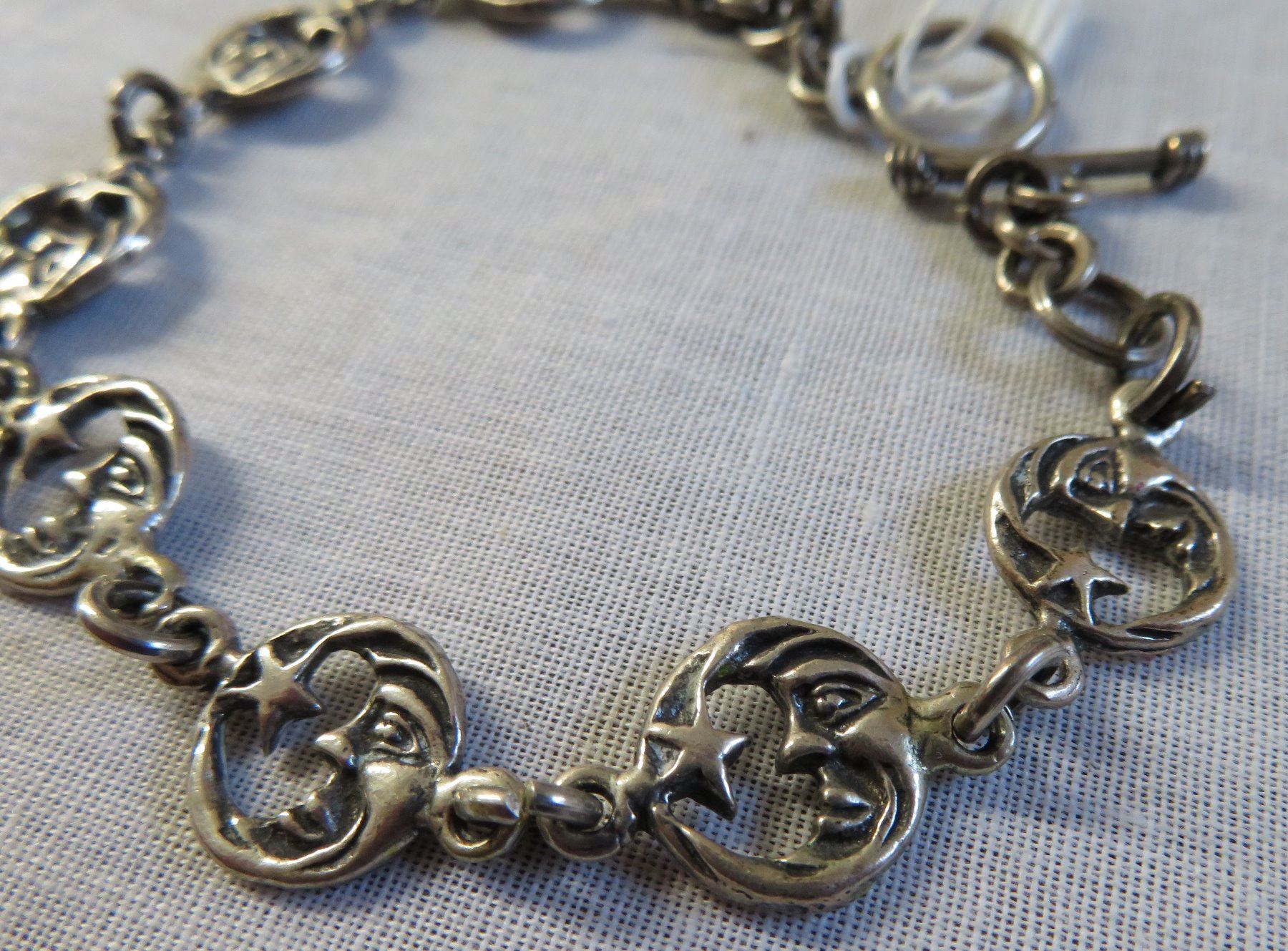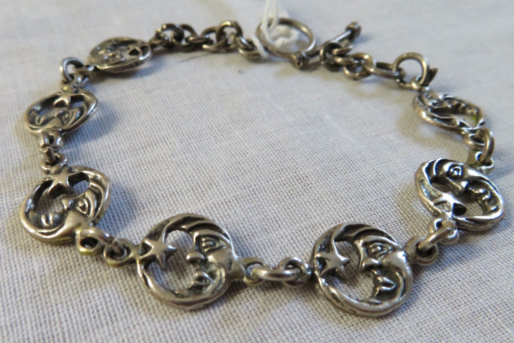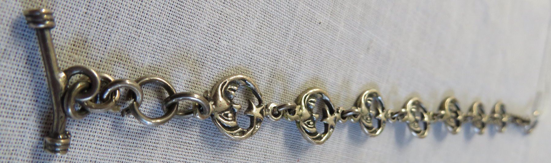 Mexican Sterling Silver Link Bracelet, c.1940s. Made of sterling silver, the item measures 6" x 2". Mex, 925. Weighs approx. 14.6 grams. Interesting bar and ring clasp, very fine piece of jewelry. Moon and star design. Condition: Good patina, see images.