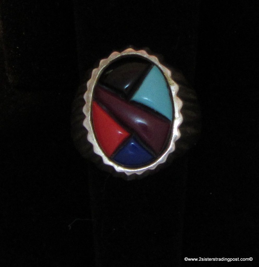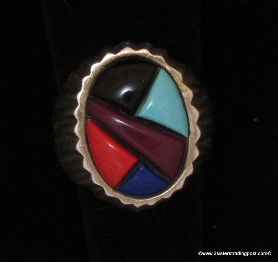 Size 8 oval ring has 5 different stones in the inlay. Ring weighs 13.8 g and the inlay not including any silver work measures 17.8 mm x 12.8mm. Ring band measures 22.1 mm x 5.2 mm. Ring is stamped .925 Mexico on one side of band and (mmil on the other side) see images for details
