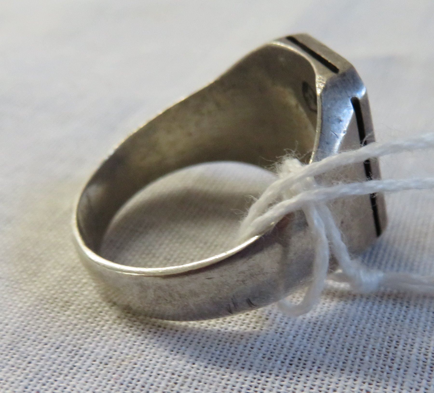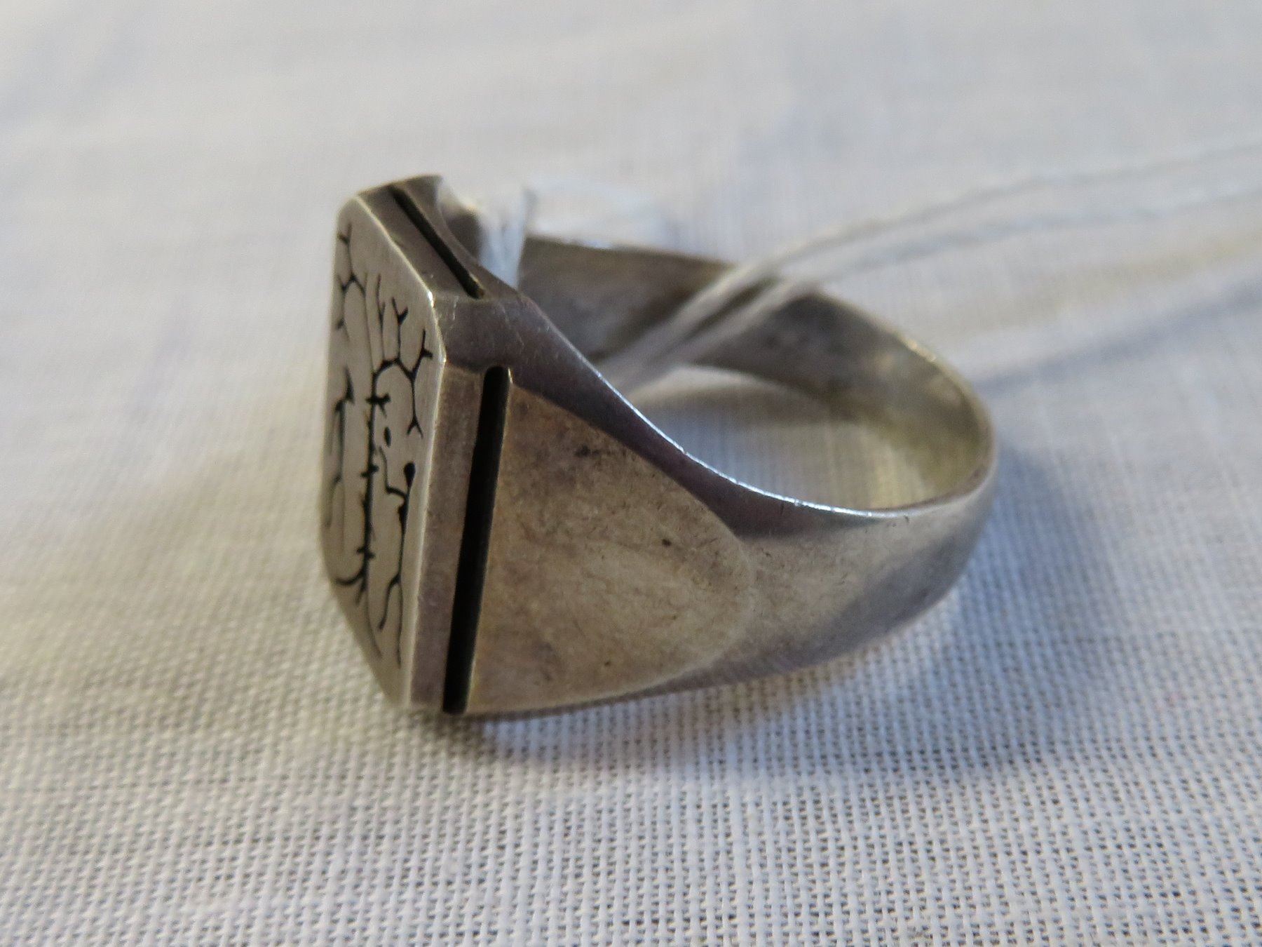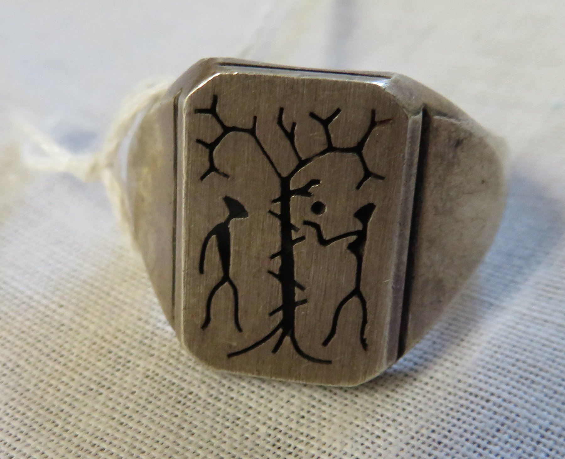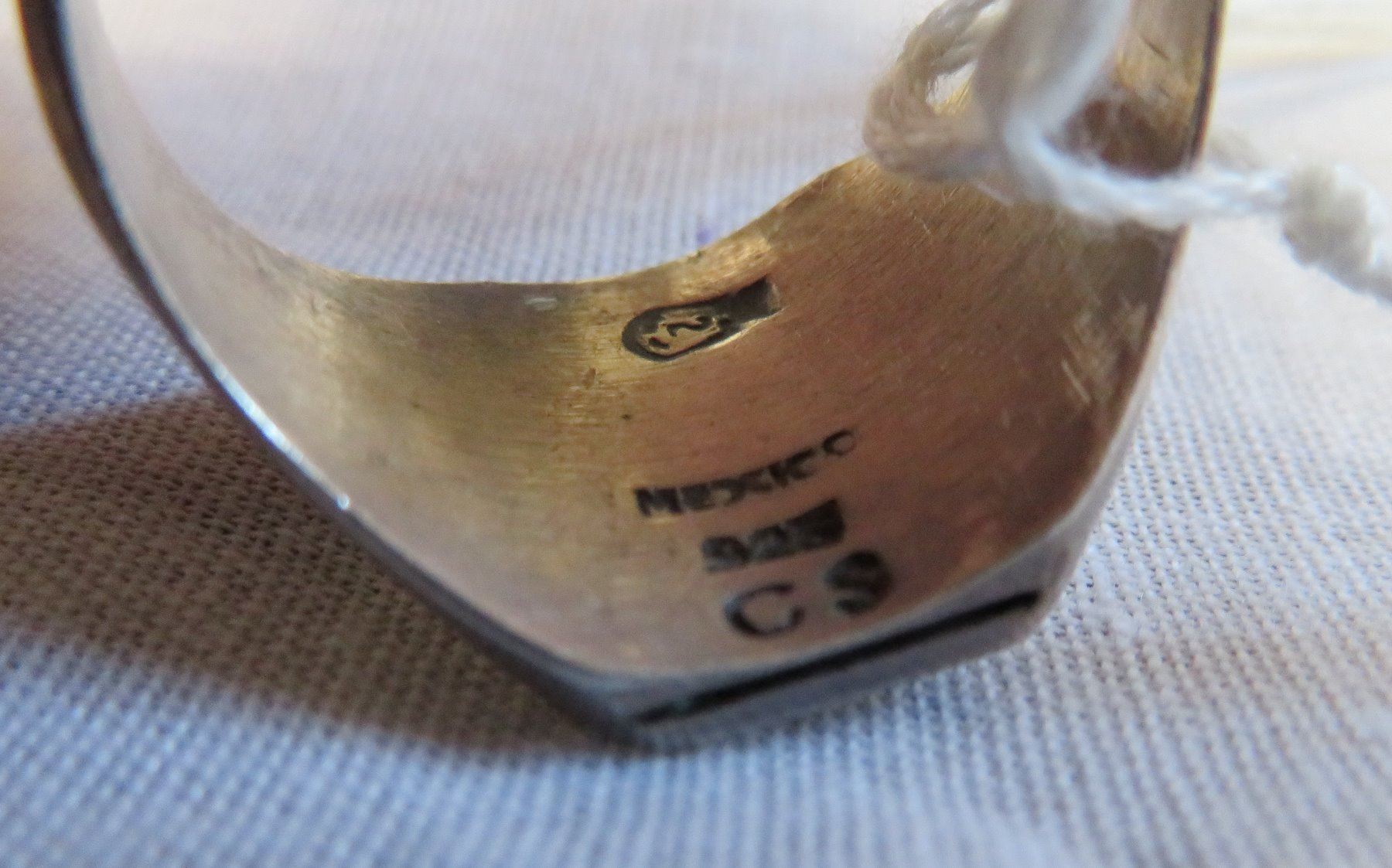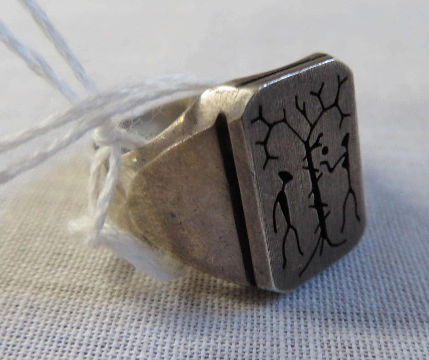 Mexican Sterling Silver Ring, c. 1960s. Made of sterling silver, the size " " ring measures 1" x 5/8" x 1" and weighs approx. 9.4 grams. Believed to depict man's fall from grace. Condition: Great, minor scratch, see images. Shipping: $10.50 w/insurance and signature.