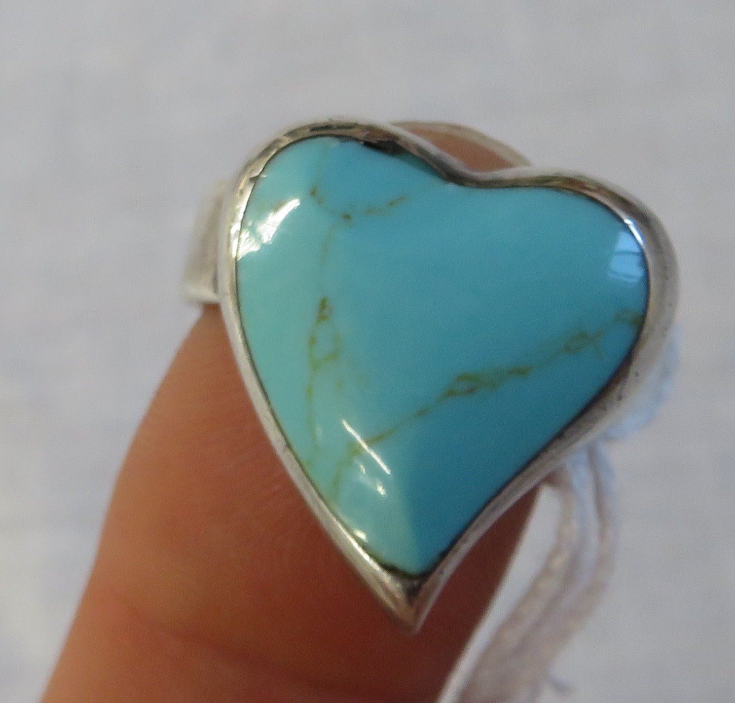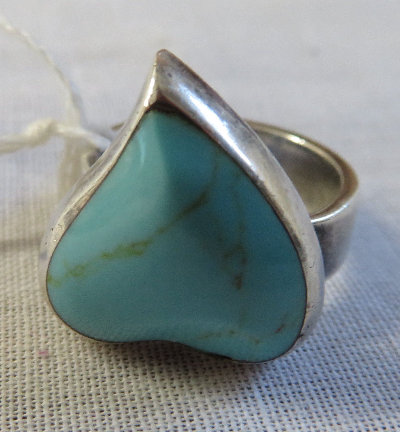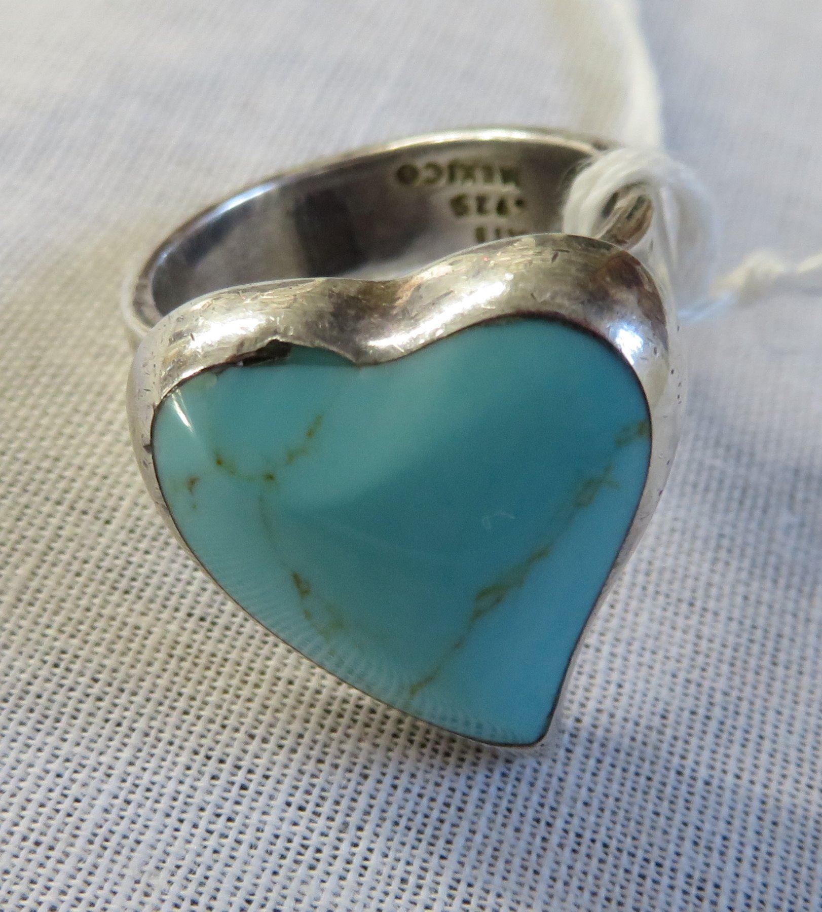 Mexican Sterling Silver & Turquoise Heart Ring, c. 1960s. Made of sterling silver and turquoise, the 7 3/4 size ring measures 1" x 3/4" x 1". ATI .925, Mexico. Wonderfully polished turquoise stone in heart setting. Condition: Very good, see images. Shipping: $10.50 w/insurance and signature.