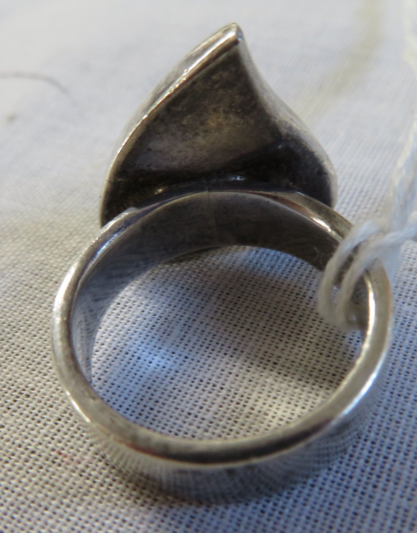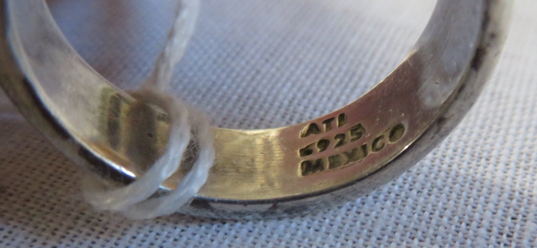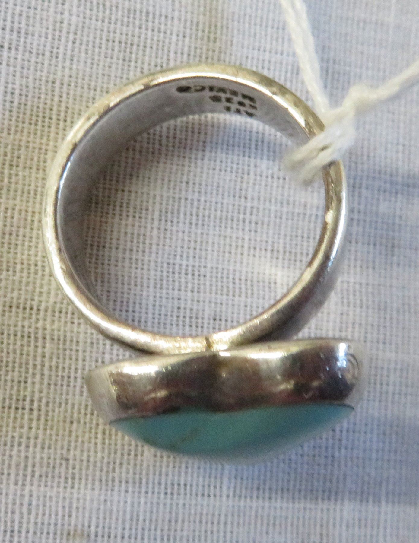 Mexican Sterling Silver & Turquoise Heart Ring, c. 1960s. Made of sterling silver and turquoise, the 7 3/4 size ring measures 1" x 3/4" x 1". ATI .925, Mexico. Wonderfully polished turquoise stone in heart setting. Condition: Very good, see images. Shipping: $10.50 w/insurance and signature.