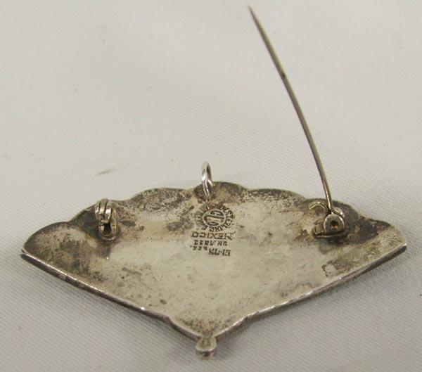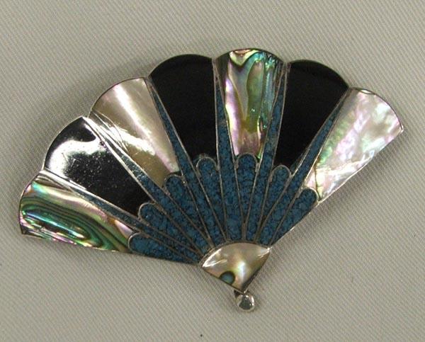 Mexican Sterling Turquoise Fan Pin/Pendant. Inlay with mother of pearl, jet and turquoise chips. Measures approx. 1 1/2'' x 2 1/2''. Buyers Pay Actual Shipping and Handling Charges(see terms and conditions for more information).