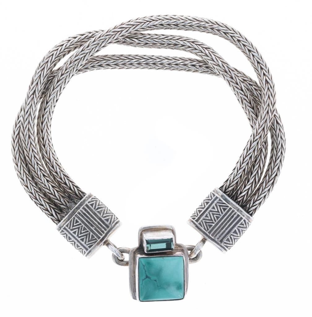 Featured in this lot is this Mexican sterling silver turquoise and Iodite bracelet, signed . The bracelet features a wonderfully and professionally crafted sterling silver construction with a triple herringbone square chain and shows clasp placements with geometric patterns tooled into the face of the placements and embossed round patterns to the underside of the placements. The male clasp shows a beautiful square cut Kingman turquoise cabochon with a beautiful light blue to darker blue coloration and a beautiful luster. The second stone is a marquise cut green Iodite gemstone with a transparent look and beautiful green luster. The condition of this bracelet is good with no obvious signs of damage and in good overall condition. The measurements from the clasp to clasp are 7 3/4" and the width of the bracelet are 3/4". The collective weight of the bracelet is 42.3g.