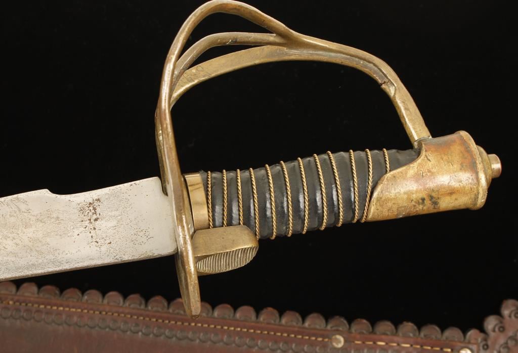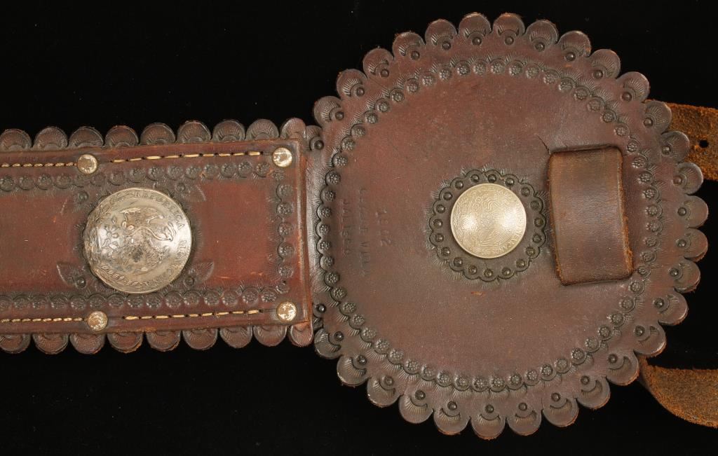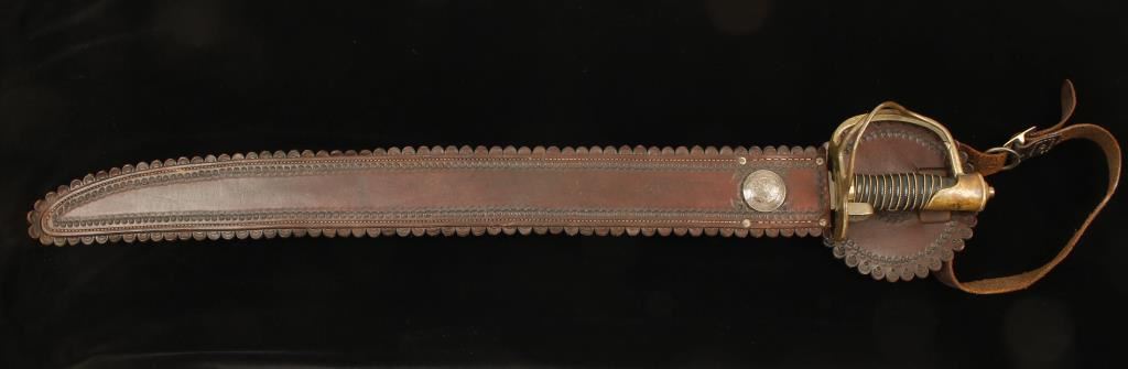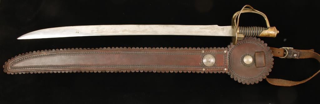 Leather scabbard signed 'CEAZAR VILLA', Jalisco marked and dated 1902 with Mexican coin conchos. Approx 28".