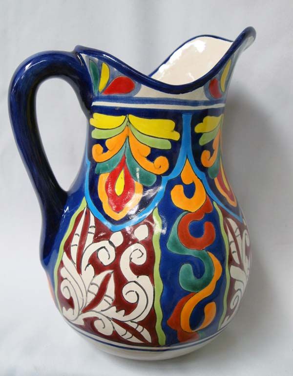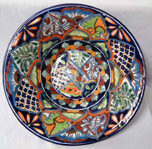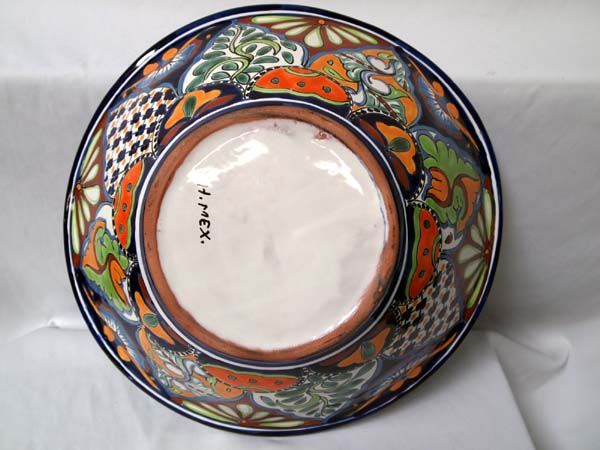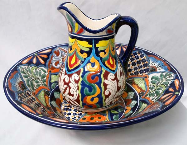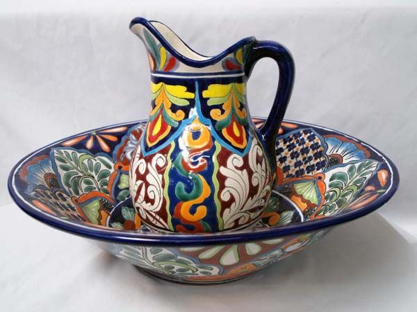 Mexican Talavera Hand Painted Large Pitcher & Bowl. Fine example of Talavera pottery. Cobalt blue with red, yellow, gold, green and other rich colors. Bowl is 19'' Wide x 5.5'' High. The pitcher is 11.75''Hx9''W. Signed on the bottom of the pitcher.