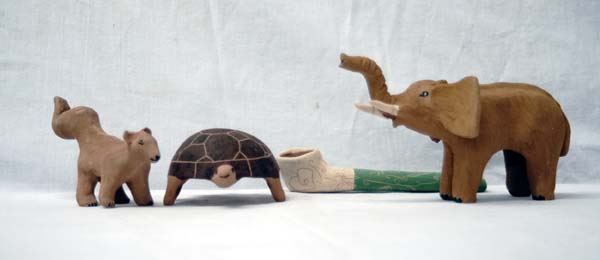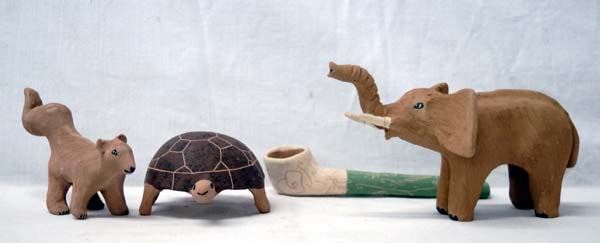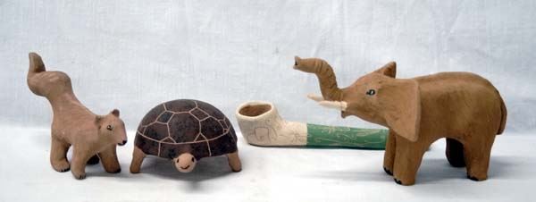 Mexican Tarahumara Pottery Animals and Pipe, largest is the elephant which measures 6''L x 3.5''T, includes squirrel, turtle, elephant (tusks have been glued), and pipe which is signed Yessenia M. C361093582