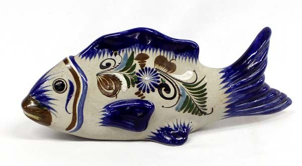 Mexican Tonala Pottery Fish, measures 3'' x 12'' x 5'', beautiful cobalt blue along with various earthtones