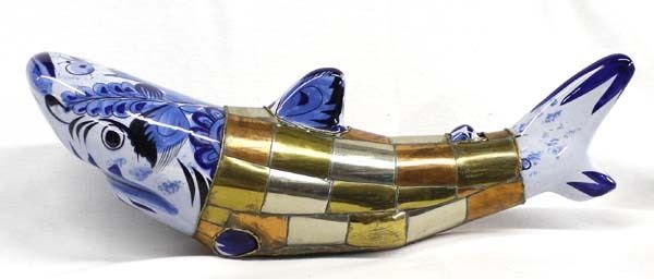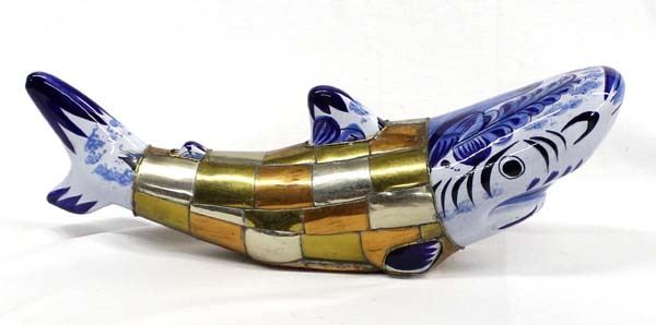 Vintage Mexican Tonala Pottery and Metal Shark, measures 5.5'' x 17'' x 4'', brass, copper, and silvertone metals