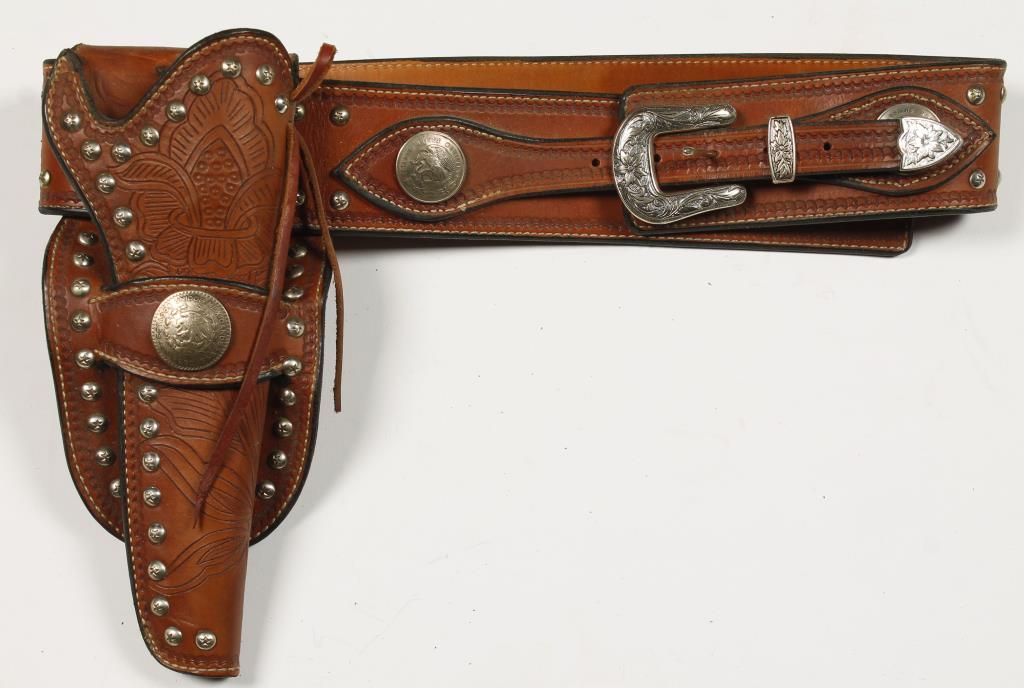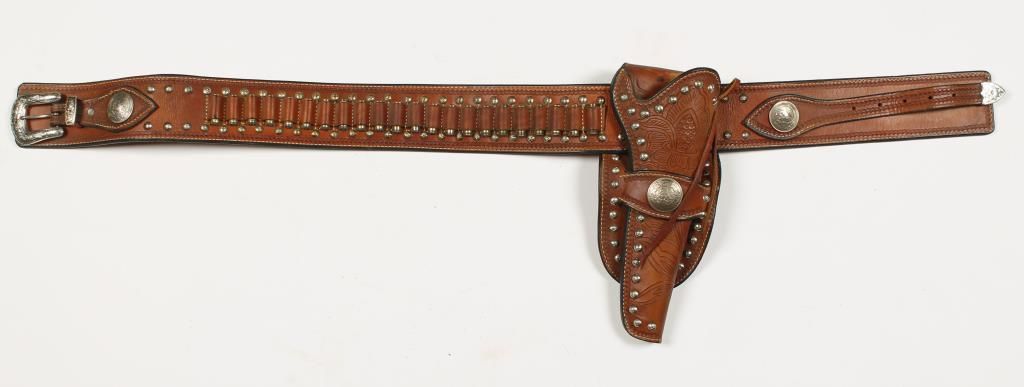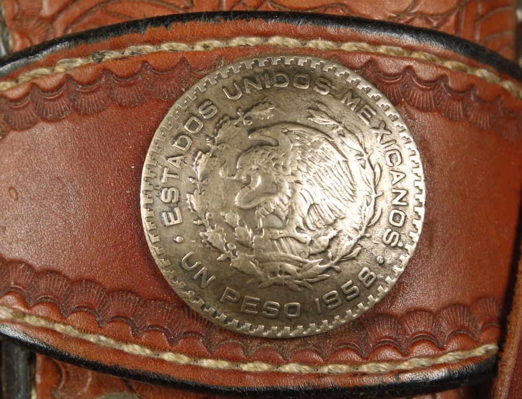 For 38 special. Brown leather with Mexican coin conchos and sterling silver buckle and accents. Holds (22) rounds. Approx 40". Shows use but in overall good condition.