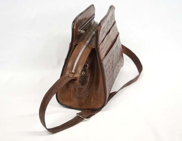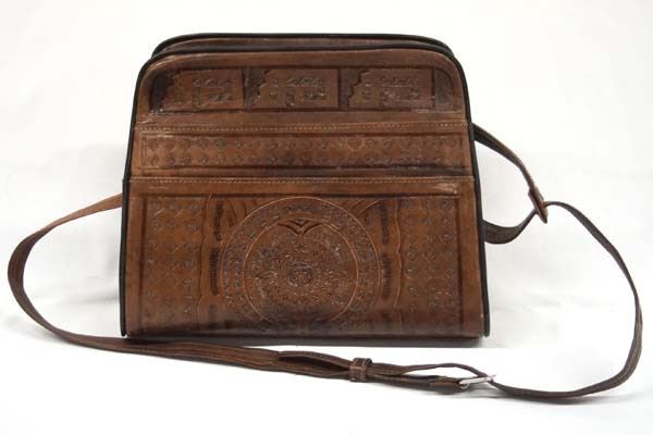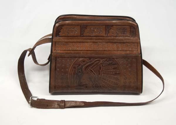 Vintage Mexican Tooled Mayan Calendar Leather Purse, measures 9'' x 10'', 3 zippered compartments, adjustable shoulderstrap