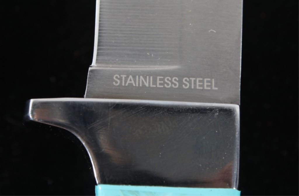 Available in this lot we have a Mexican turquoise inlay handled knife with leather sheath. The knife is made in the Navajo style with a stainless steel blade and a grip made of multi stone inlay and reconstituted turquoise. The blade shows the classic drop point with a steel guard and full tang. The knife comes with a black leather sheath reading "Buck" across the front. The knife shows good condition overall and measures 8 1/2" long with a 3 3/4" long blade.