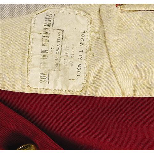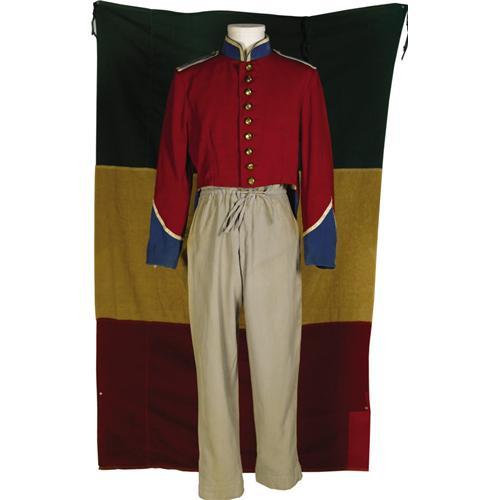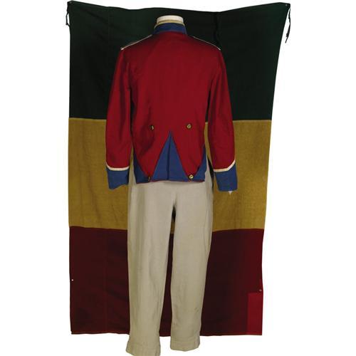 <B>Mexican Uniform and Flag from "The Alamo."</B></I> John Wayne drew on what he learned from John Ford and Howard Hawks when he made his own directorial debut in 1960 with <I>The Alamo,</B></I> his sprawling, ambitious, epic take on one of history's most famous last stands (the full-scale replica set alone took two years to build). The uniform consists of a pair of beige trousers and a red and blue jacket with white trim and a Republic Pictures property stamp on the lining; the flag is a replica of the Second National Flag of Mexico measuring 40" x 60". Both are in Excellent condition with a mild amount of staining from age and use during production. <I>Accompanied by COA from L.A. Prop & Wardrobe Co.</B></I>