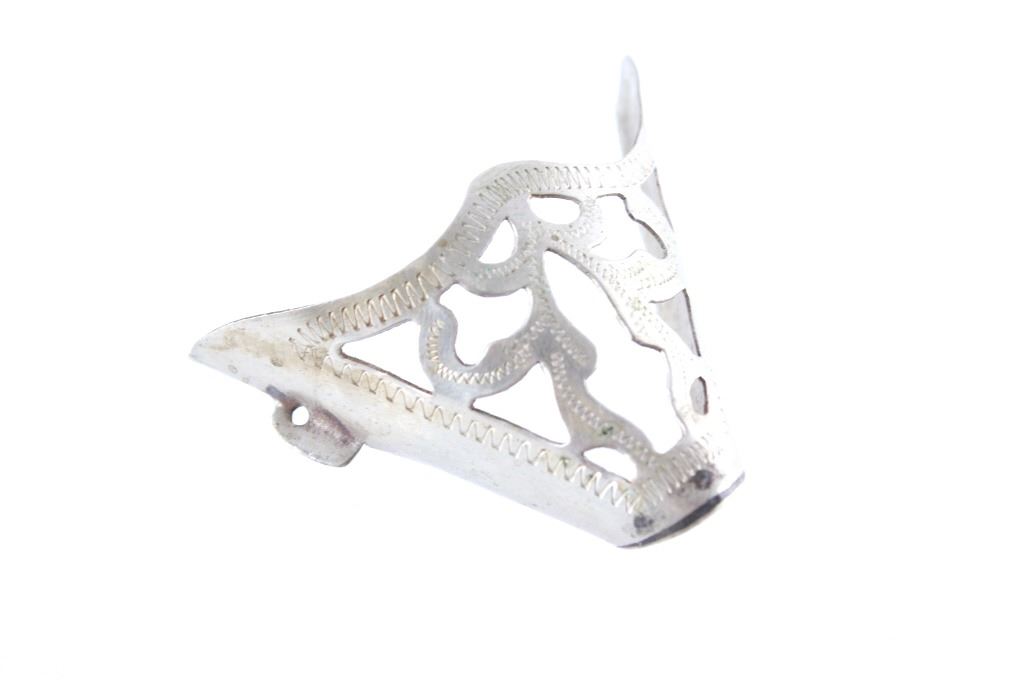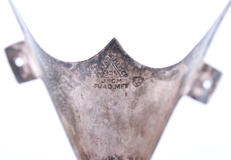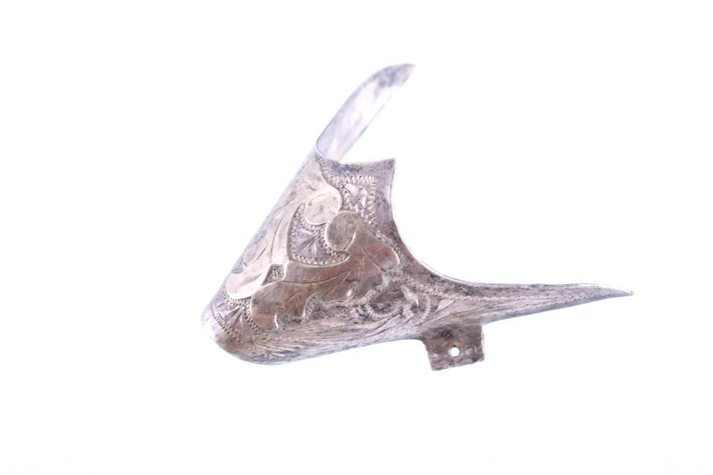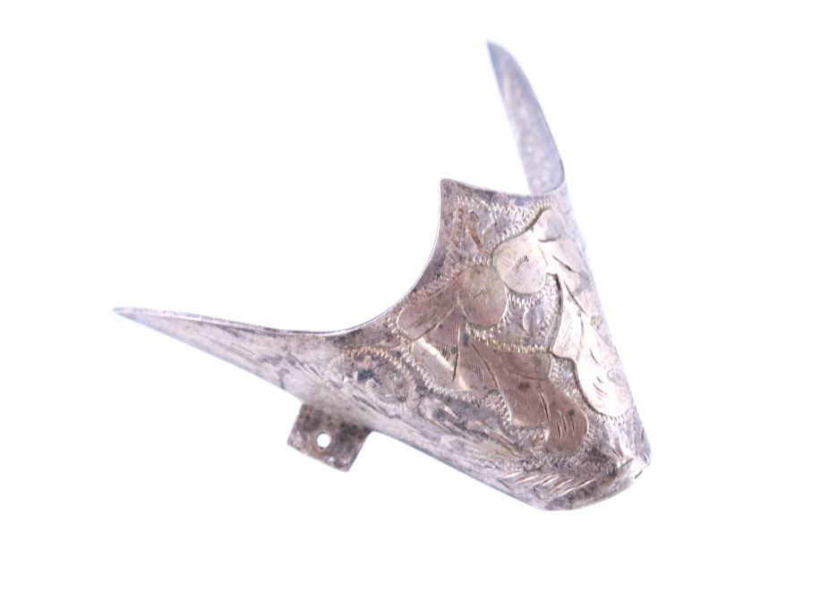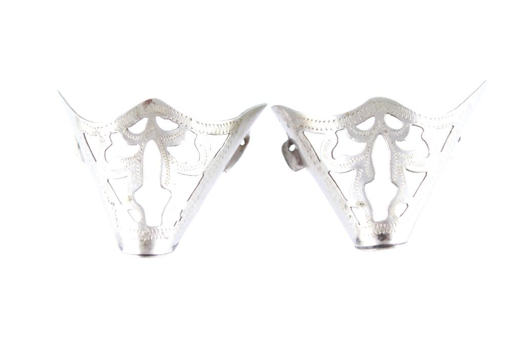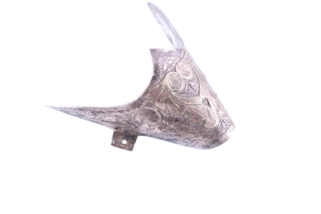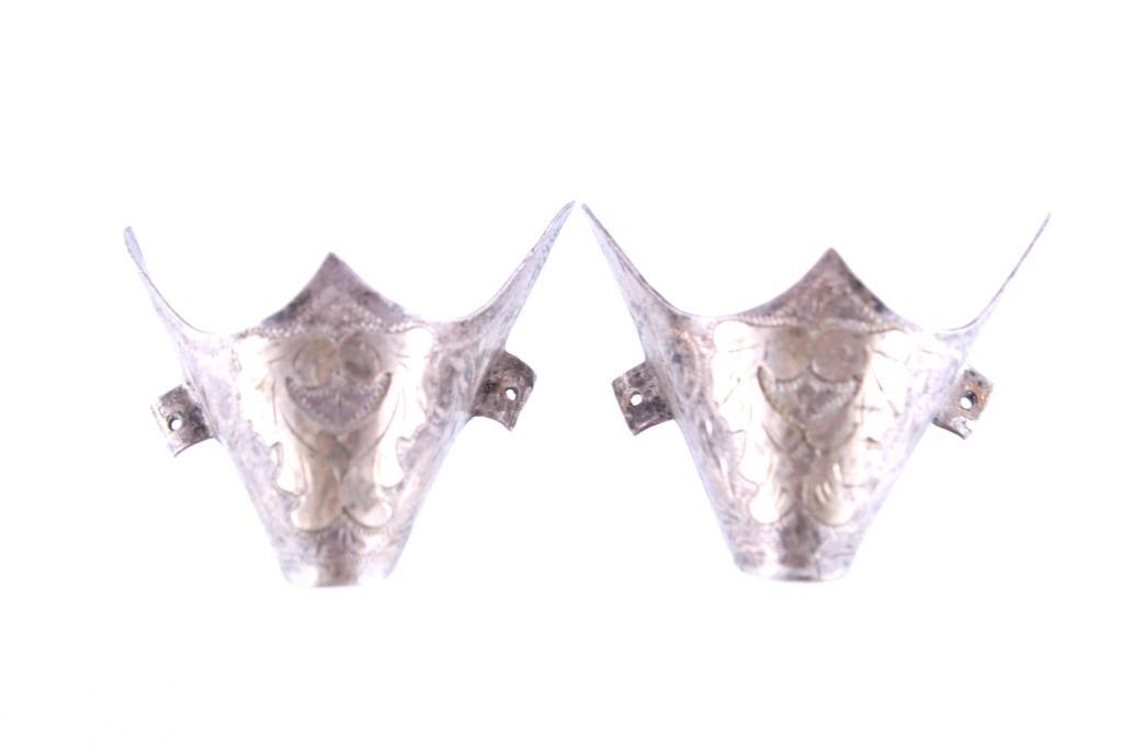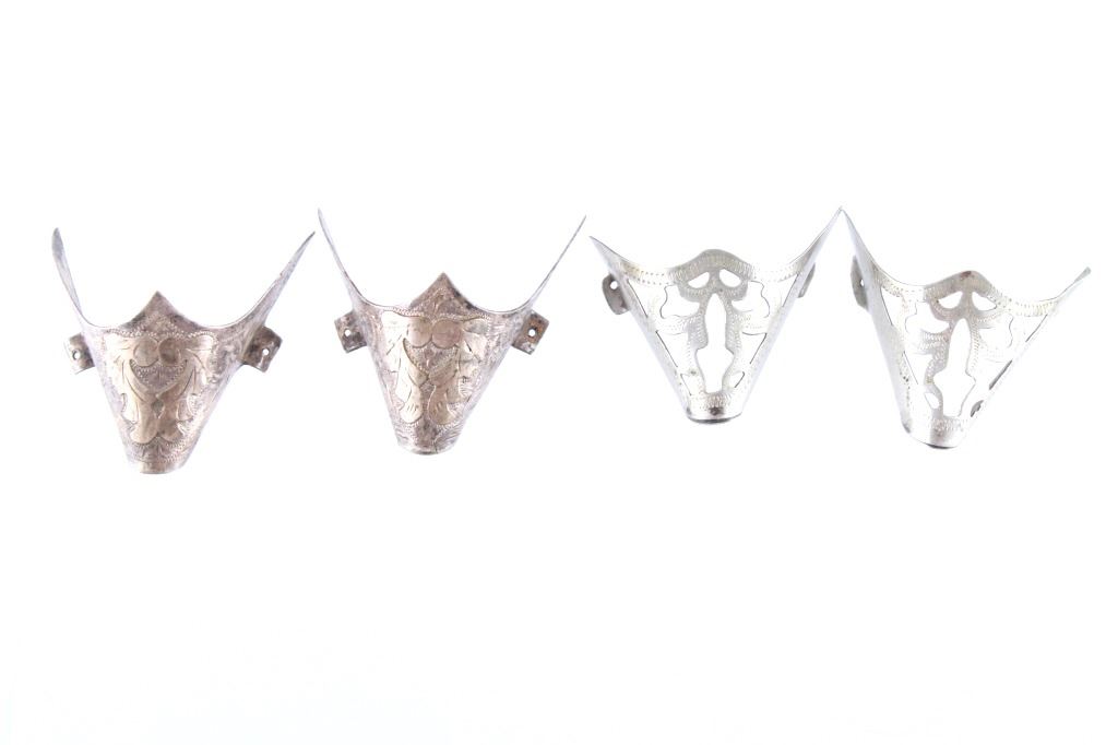 Featured in this lot is this Mexican Vaquero cowboy silver boot tips circa 1930's. There are two sets of boot tips in this collection. The first pair are beautifully tooled with floral decoration and crafted from .925 and from Platade Jalisco and is marked on the underside of the boot tips. The second pair is tooled and framed with western decoration and constructed from silver and has been chemically tested. The condition of this collection of boot tips is good with a slight patina consistent with the age of the boot tips and in good overall condition. The measurements of the boot tips are 1" x 2 1/2" x 1" and 2" x 2 1/4" x 1". The collective weight of the boot tips are 47.5g
